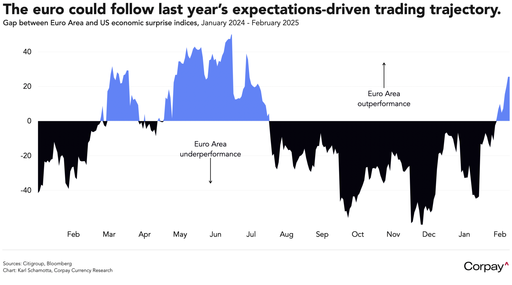 The common currency is up almost 1 percent on a year-to-date basis as investors bet on a peace dividend arising from a potential ceasefire in Ukraine, position ahead of an expected increase in defence spending, and move to anticipate a more growth-positive policy mix from the German government after this weekend’s elections. Economic surprise indices—which measure the difference between forecasts and realised data—have turned decisively in the euro’s favour in recent weeks, suggesting that we may be seeing a repeat of last year’s trading dynamic play out, with excessively-low expectations setting the stage for a period of outperformance against the dollar.