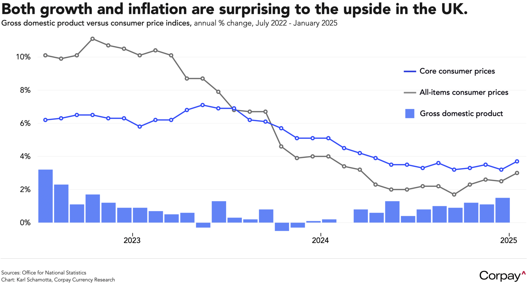 A hotter-than-anticipated inflation report failed to elicit a response from the British pound this morning, given that the Bank of England Governor downplayed the likely impact on monetary policy settings. Headline prices climbed 3 percent in the year to January, accelerating from 2.5 percent in December and topping forecasts for a 2.8-percent print on a tax-driven jump in private school fees*, unexpected resilience in airfare costs, and a rise in food and beverage prices. Andrew Bailey called this a “short-run hump,” outlining the need for a “cautious” approach, and highlighting persistent weakness in the economy as one of the most significant factors motivating the central bank’s easing efforts.