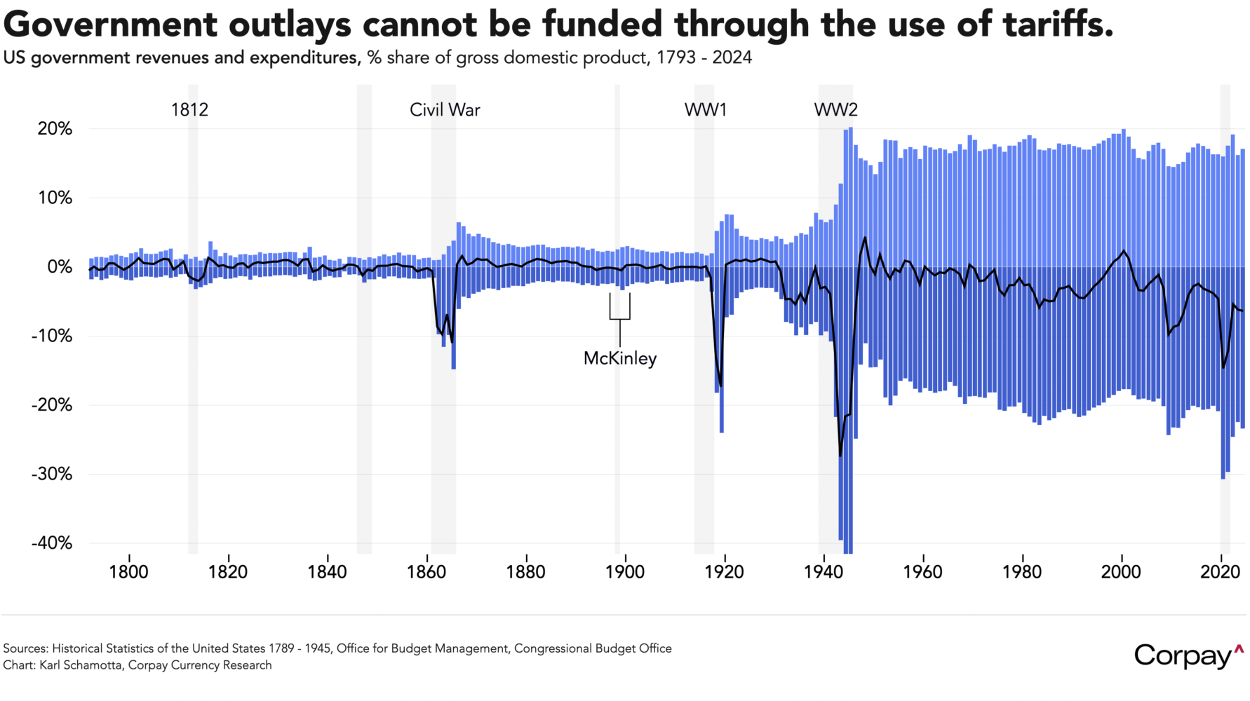 On a slightly-digressive note: I was working through historical data on US fiscal revenues and expenses over the weekend, and found that the world that Donald Trump and some of his allies describe—in which tariffs can replace income taxes in funding the government—truly doesn’t exist any more. The state shelled out less than 3 percent of gross domestic product when William McKinley occupied the Oval Office, but now spends more than 23 percent, with the vast bulk of its outlays going on categories—like defence, healthcare, and Social Security—that the current president has promised not to touch. Even if taxes on imports were raised to 100 percent (while implausibly leaving purchasing patterns intact and keeping growth levels stable**), more than half of government funding would still need to come from elsewhere.