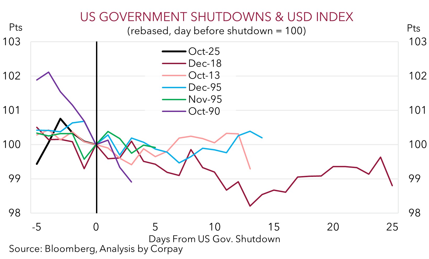 As mentioned, another US government shutdown is looming given neither the Republicans nor Democrats are showing signs of budging. Barring a very last minute deal to fund government functions operations will begin to be shutdown from ~2pm AEST. This isn’t one of those instances where the US ‘debt ceiling’ is also involved but there can be economic and market consequences. US federal workers will be furloughed, while President Trump has warned of mass layoffs. This might weigh on US economic activity. On top of that things like official economic statistics, such as this Friday’s US jobs report, could be put on hold. Looking back, there have been 19 US government shutdowns since the late-70s, ranging from 1 to 35 days. The longest occurred in President Trump’s 1st term, and there is a chance this iteration drags out given reduced pressure to strike a deal because there isn’t a risk of a US debt default. In the current environment we think the failure to avoid a government shutdown may further highlight the more challenging backdrop in the US which in turn may exert downward pressure on the USD. As our chart shows, the USD has tended to weaken a little during the past few US shutdowns.