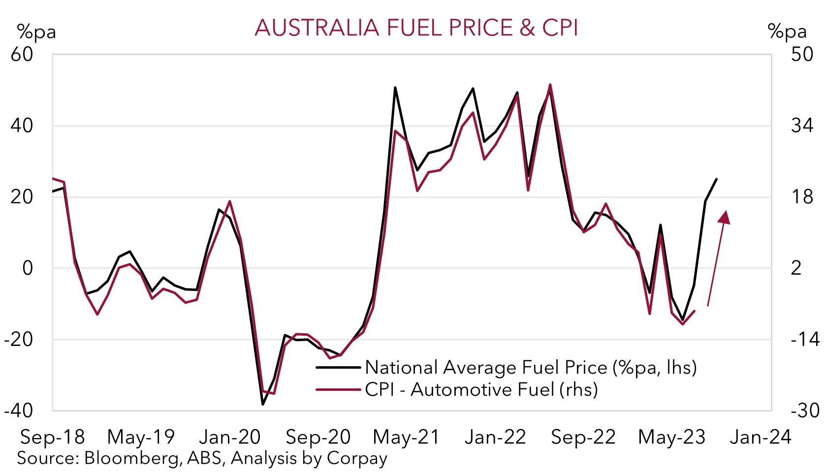 We think the AUD’s bounce back can extend this week, particularly on the crosses. Locally, the monthly CPI indicator for August is released (Weds) and the latest retail sales data is due (Thurs). The sharp lift in petrol over the past few months, the weaker AUD and its flow-through to imported prices, and stickiness across services inflation (which will be better captured in this month’s CPI data) points to a meaningful re-acceleration in annual inflation. We see upside risks to the market’s forecasts (mkt 5.2%pa from 4.9%pa in July). Added to that retail sales may post another positive result (mkt +0.3%) with the boost to spending on services related to the Women’s Football World Cup more than offsetting the impact from higher mortgage costs. In our opinion, solid spending data and/or a jump up in inflation could generate an AUD supportive jolt on near-term RBA rate hike expectations. Markets are only assigning a ~38% chance of another 25bp hike by November. Offshore, as outlined, we think the USD could soften if the political divide sees the US government shutdown once again, and the mix of a potential negative growth hit and slower US core PCE deflator exerts some downward pressure on longer-dated US interest rate pricing.