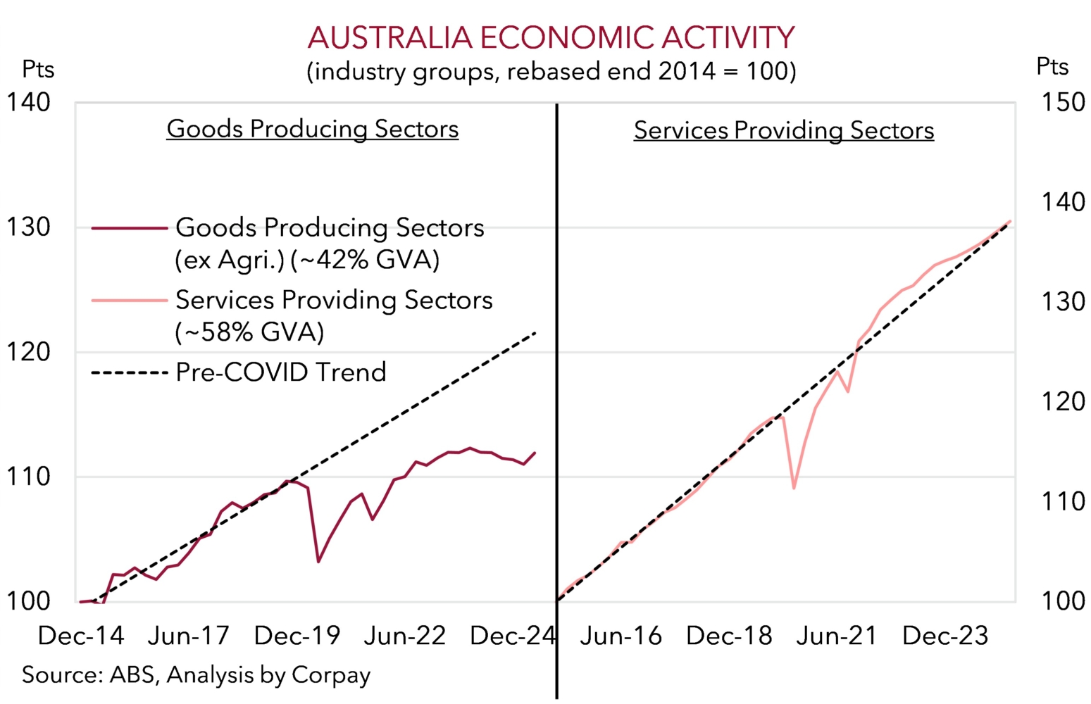 A closer look under the hood finds that the RBA’s nervousness about housing related inflation was on the money. New dwelling inflation increased, as did rents. More broadly, sticky ‘services’ inflation quickened, in some part due to rents but this was also a function of the elevated level of activity across the economy, especially labour intensive sectors (chart 2). Unit labour costs are still growing briskly. When combined with Australia’s poor productivity domestic/services inflation may remain sticky for a while yet, at a time ‘goods’ prices have also begun to perk up again (chart 3).