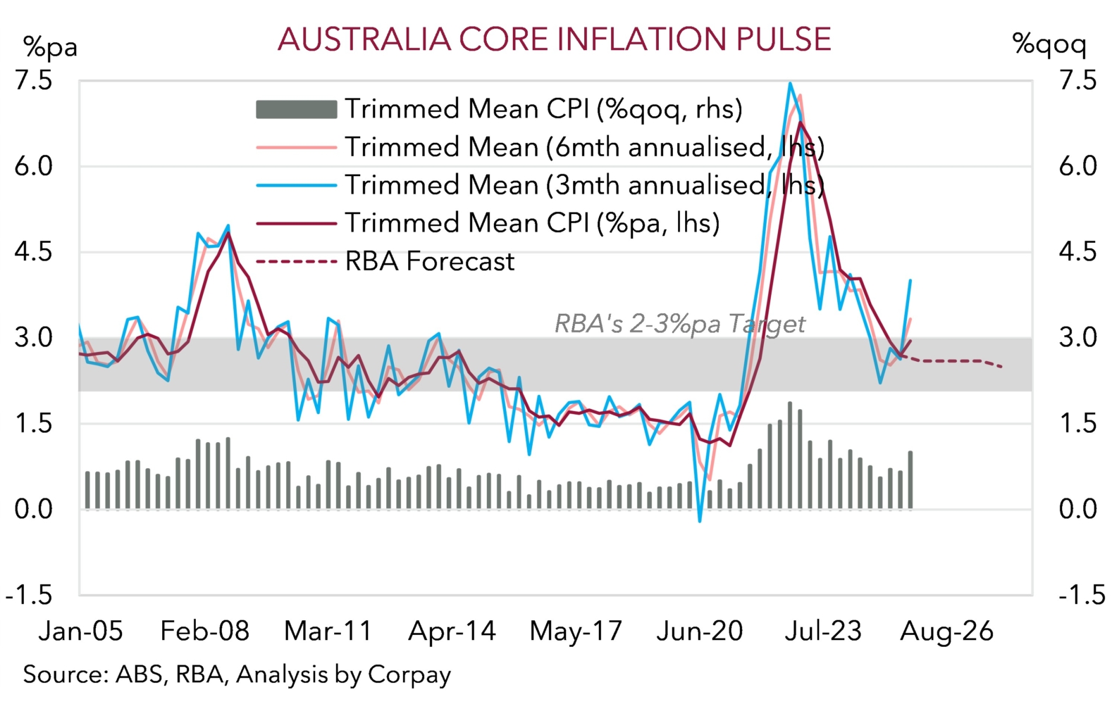 The Q3 CPI result was stronger than the signal coming from the monthly partial indicator, and importantly it is well north of the RBA’s expectations. Indeed, earlier this week RBA Governor Bullock noted that a result ~30bps above its ~0.6%qoq estimate would be a “material miss”. The actual outcome is more like an “uber miss” that should rattle a few policymaker nerves about the inflation trajectory.