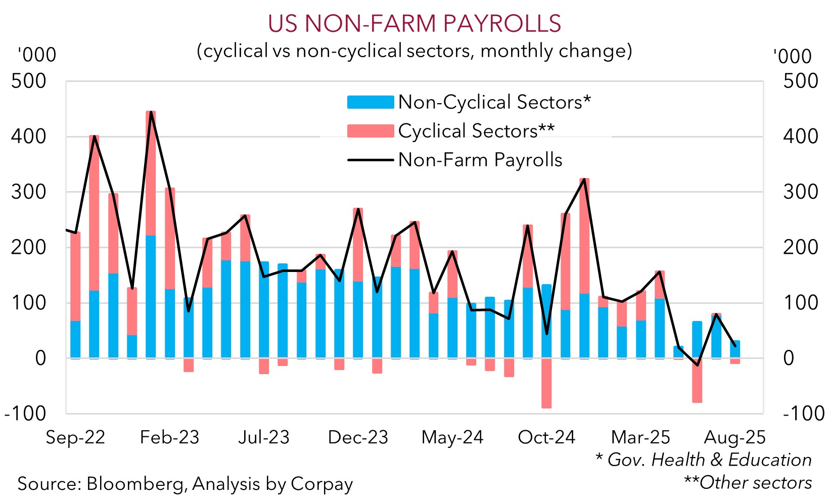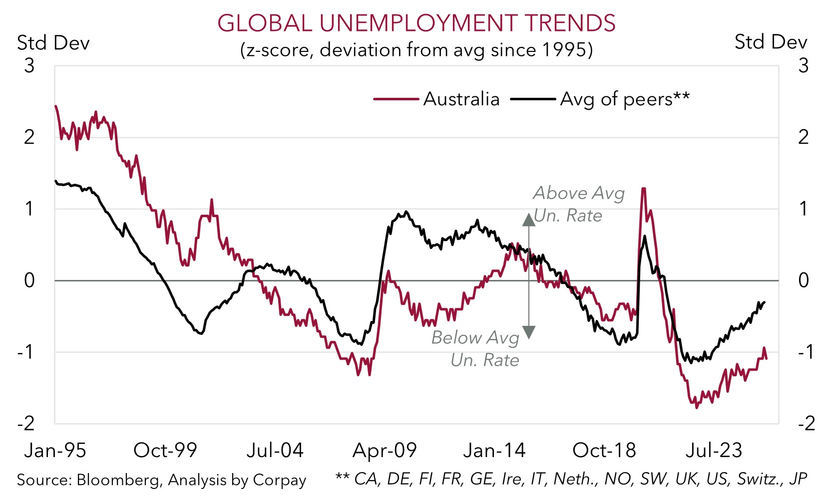 In the US this week, as mentioned above, the delayed September non-farm payrolls data is due (Thursday night AEDT). A modest improvement is looked for, which if realised could see the USD tick up and in turn exert some downward pressure on the AUD and NZD. That said, while more headline/data driven volatility in the AUD should be anticipated in the short-term, we remain of the view that an improvement in US/China trade relations, diverging policy trends between the RBA and central banks such as the US Fed, and favourable yield spreads, can help the AUD grind higher into year-end and over early 2026. As shown below, the Australian labour market remains in a healthier position to its peers with the upswing in unemployment not that large. This also suggests the RBA may be hard pressed to lower rates again this cycle given lingering inflation pressures across the economy.