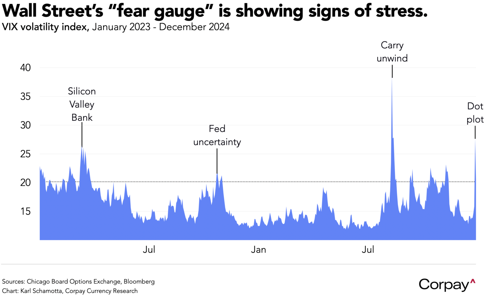 This year’s Santa rally came with a Fed clause. Markets are recovering, but remain in turmoil after officials at the world’s most powerful central bank turned far more hawkish on the year ahead than almost anyone had expected even as they lowered benchmark interest rates for a third consecutive time. The dollar is trading near a post-2022 peak, ten-year Treasury yields are holding at seven month highs above 4.5 percent, most major equity indices are down more than 3 percent, and the VIX volatility index—Wall Street’s “fear gauge”—is up dramatically after hitting its loftiest levels since the August 7 volatility shock.