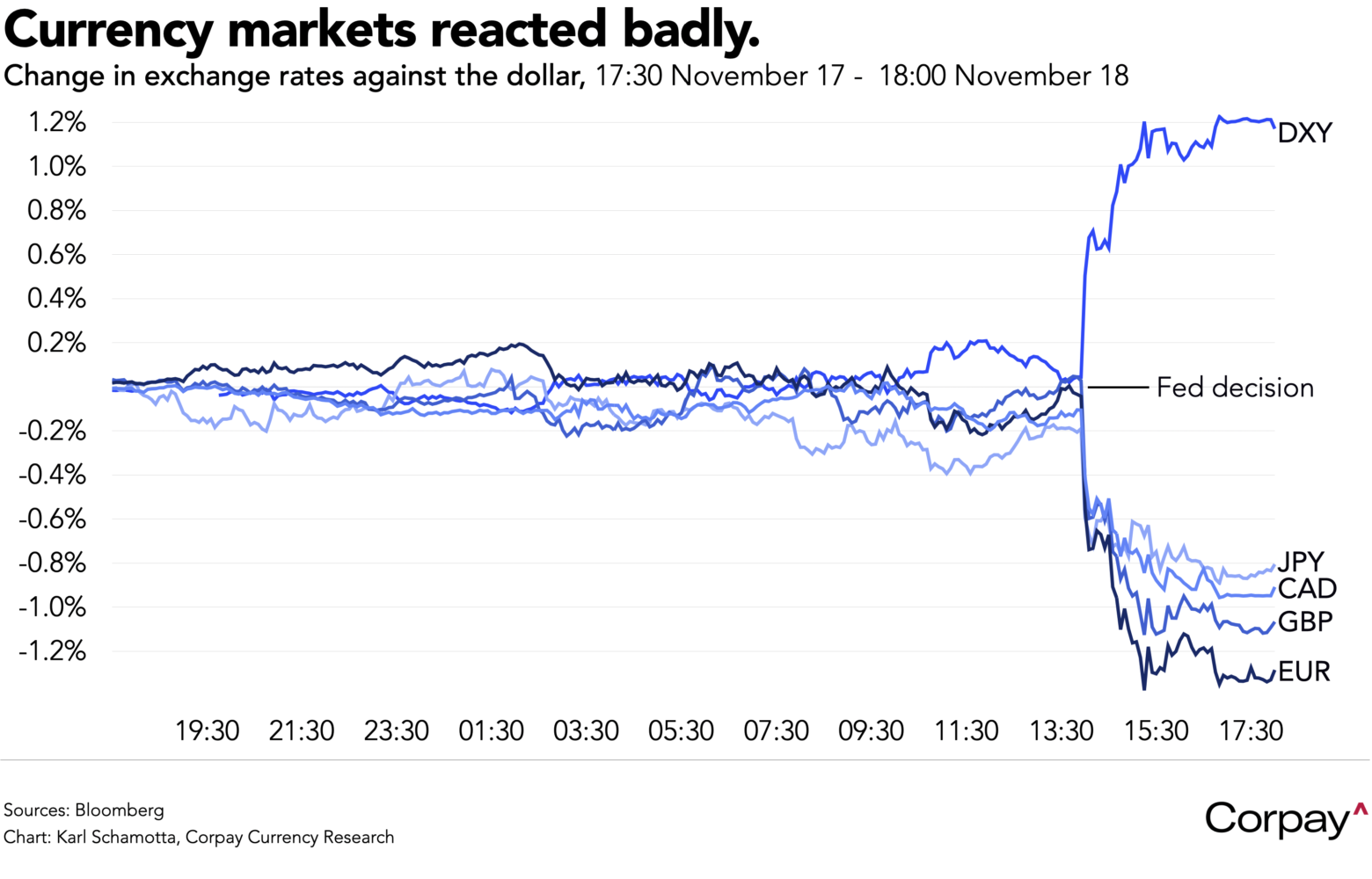 Currency markets reacted dramatically, with a spike in fed fund futures—which measure market views on the central bank’s policy trajectory—triggering a rally in the dollar against all of its rivals. To some extent, this is now unwinding, but most majors remain on the defensive against a resurgent greenback.