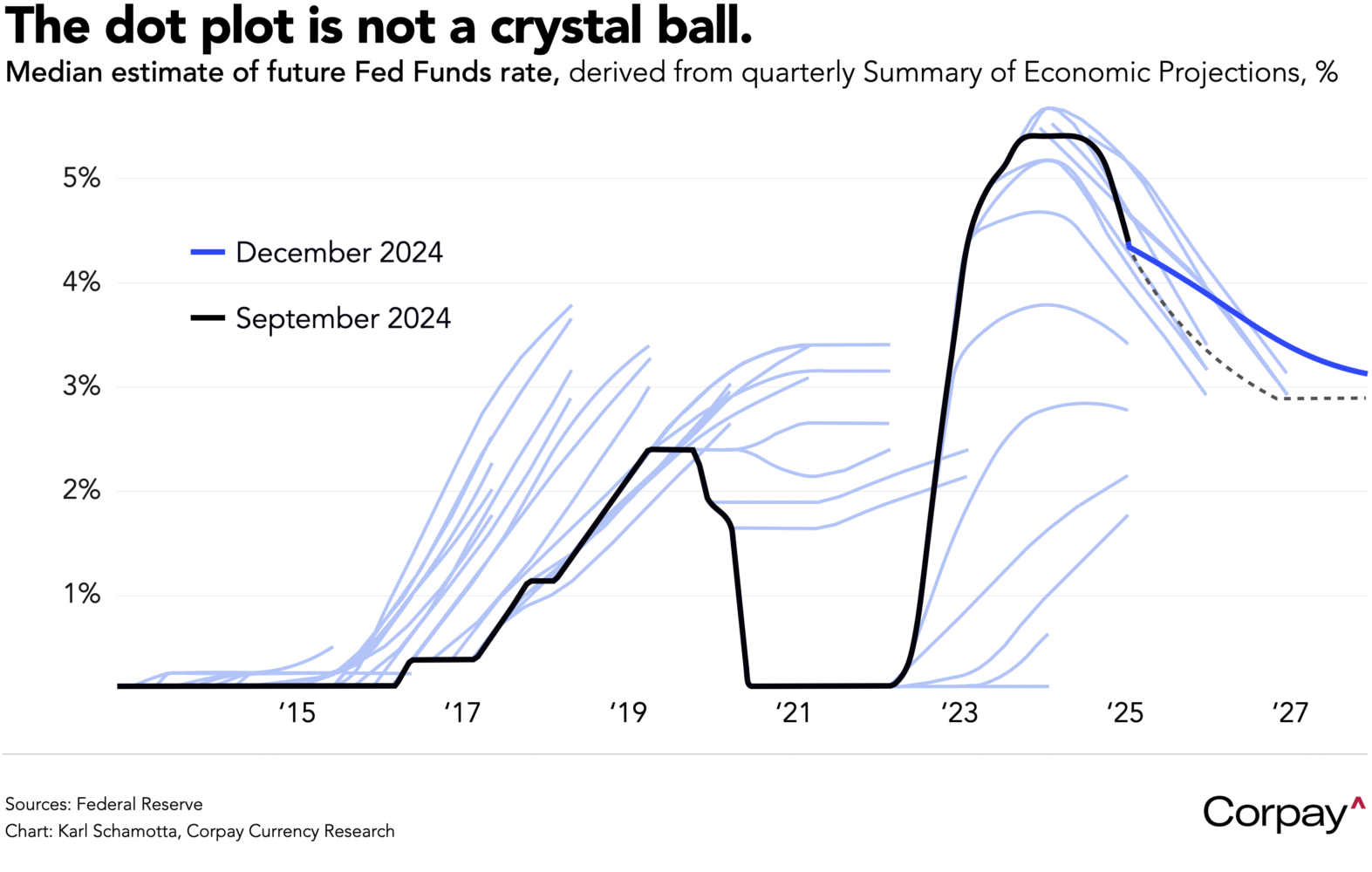 The currency market retracement could gain steam. Fed officials are not contemplating a deliberate tightening in financial conditions—their inflation expectations moved up in line with interest rate estimates, meaning that real rate projections remained unchanged. As we warned in yesterday’s missive, the decision landed within a fragile year-end rebalancing period that is often punctuated by extreme moves. And history suggests that the “dot plot” is rarely accurate in determining how the Fed’s policy path ultimately plays out.