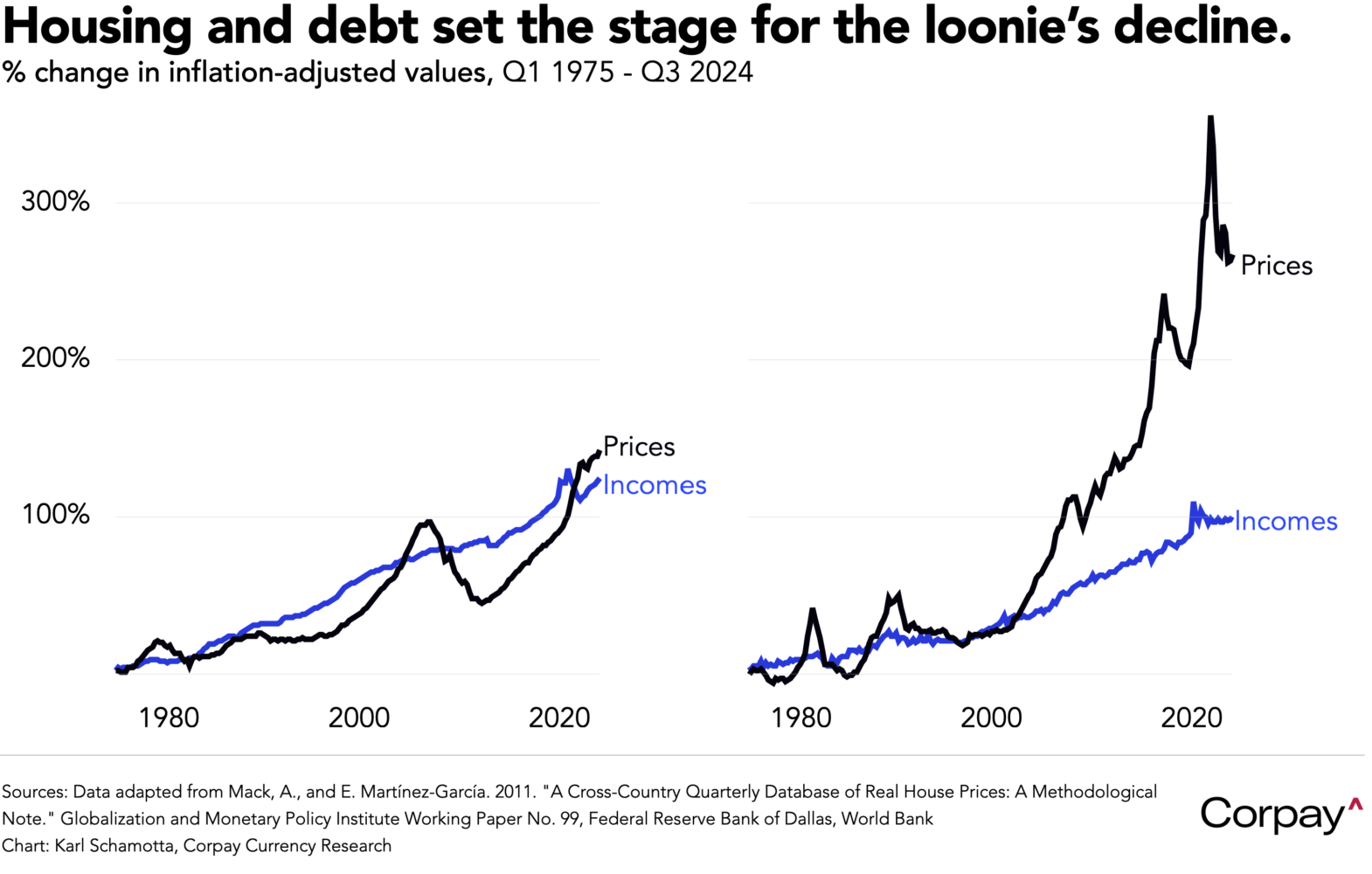 Here in Canada, the loonie is trading near a post-pandemic low. This is generating a lot of hand-wringing among observers, and a lot of narrowly-focused observations about the causes. In our view, there are four proximate reasons for the currency’s underperformance—last decade’s end to the energy supercycle, which decimated investment in Canada’s oil and gas sector, a household sector that became horrifically indebted during the long run-up in real estate prices, a US economy that is outperforming and lifting Fed policy expectations, and Trump’s recent tariff threats. The imposition of 25 percent tariffs could certainly send the economy spiralling into recession next year. But—at the risk of sounding like fanatics*—we think the debt burden is the biggest problem, given that higher carrying costs have crushed household consumption and exacerbated the country’s vulnerability to external shocks. We also see this becoming a modest tailwind, with falling interest rates helping support a gradual recovery in the year ahead.