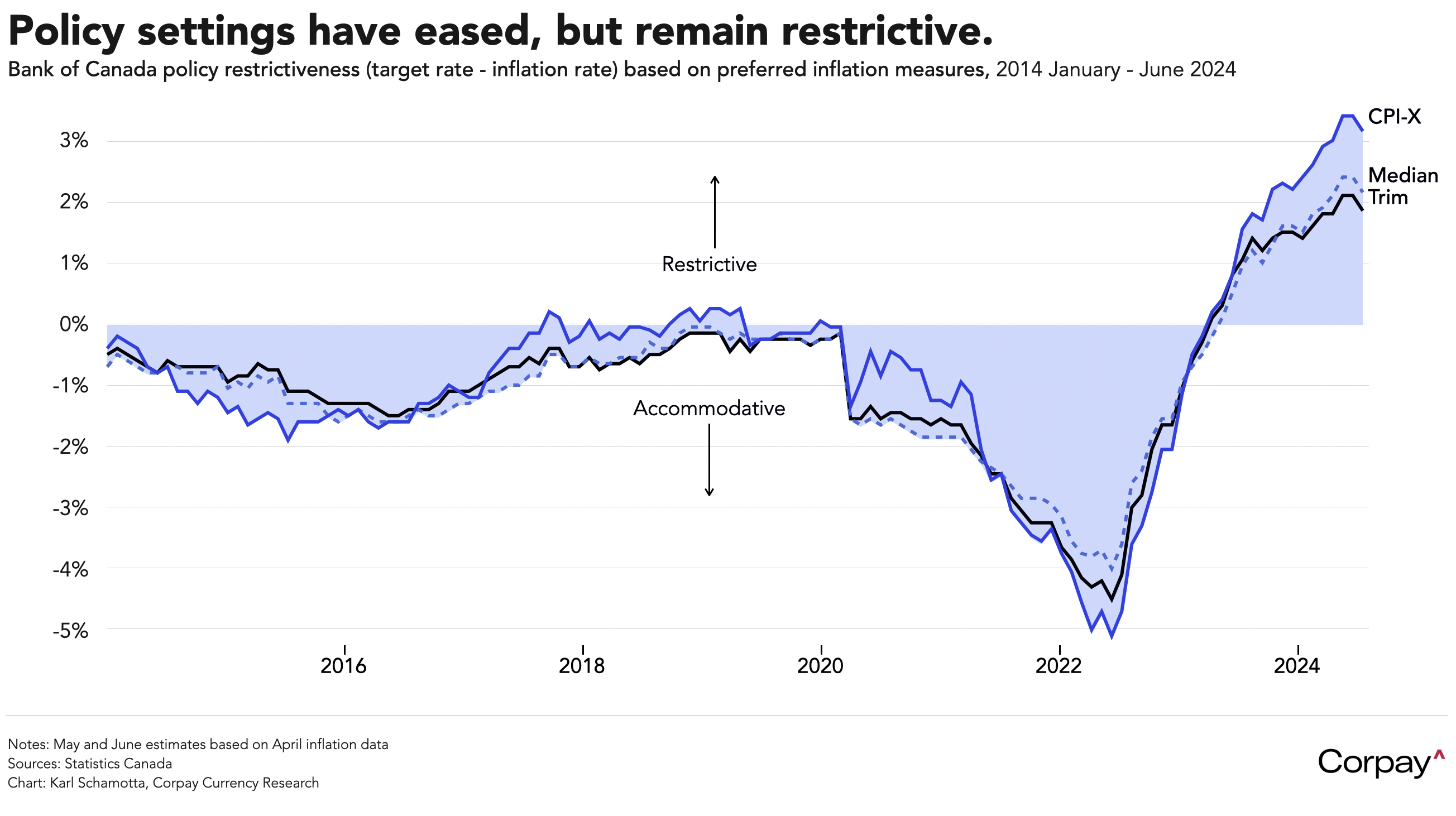 The Canadian dollar has fallen roughly 40 basis points post-decision on a rise in easing expectations and a widening in near-term rate differentials relative to the US. We suspect that downward pressure on the loonie will continue in the near term, with the economy’s deeply-embedded rate sensitivities pointing to more easing ahead. Real monetary policy settings – as measured using the gap between the target overnight rate and the Bank’s preferred inflation measures – remain deeply restrictive in real terms, and Canada is facing little risk of a US-style re-acceleration in price pressures. With allowances made for differences in data interpretation, Taylor Rule-based analysis suggests that the target rate should converge with 4 percent over the next year.