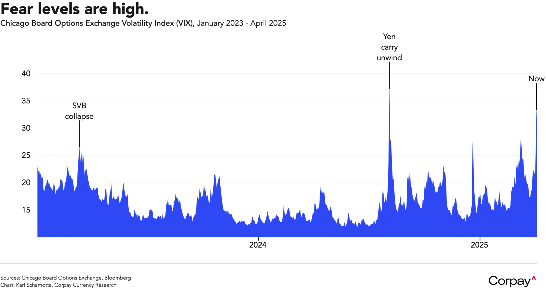 A global market selloff triggered by Donald Trump’s effort to upend the global trading system is still underway this morning, with equity futures pointing to further losses after trillions of dollars in value was erased during yesterday’s session. Most major US and international indices are down more than 5 percent from Tuesday’s levels, benchmark ten-year Treasuries are yielding less than 3.9 percent for the first time since early October, and measures of implied volatility—expectations for more turbulence in the future—are holding near levels last hit during August’s unwind in the yen carry trade and the collapse of Silicon Valley Bank in early 2023.