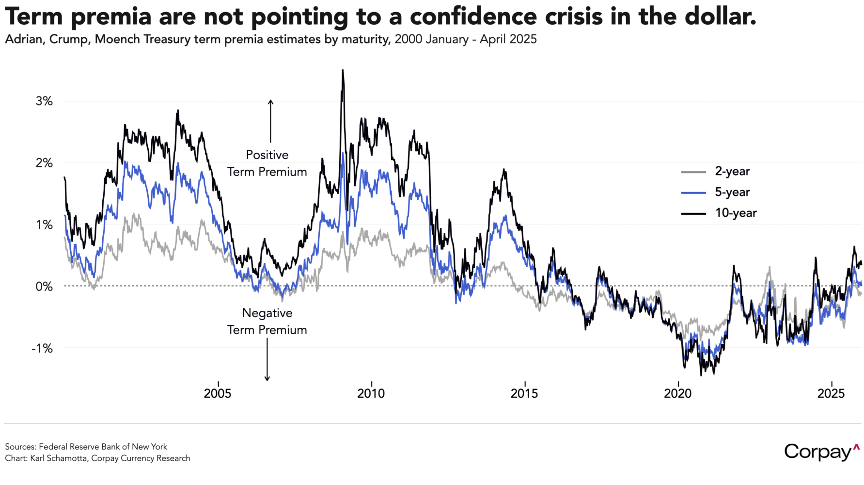 The dollar is showing signs of steadying after a bruising reversal that saw it lose all of its post-election gains, but there’s no hard evidence to suggest that this is a function of an abrupt decline in confidence in US government debt instruments, or in the dollar’s role itself. Credit default swaps on US sovereign debt have moved up only incrementally and the “term premium”—the additional return investors demand for holding long-term Treasuries compared to shorter-term instruments—remains relatively tame.