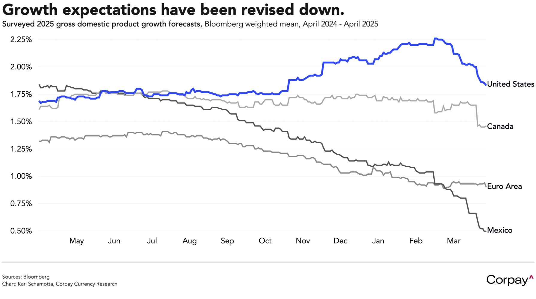 Instead, a ratcheting down in growth expectations seems to be at fault. Private sector growth forecasts have plunged since the onset of Trump’s trade war, with economists expecting supply chain disruptions, rising import costs, weaker export growth and persistent uncertainty to begin depressing activity in the coming months.
