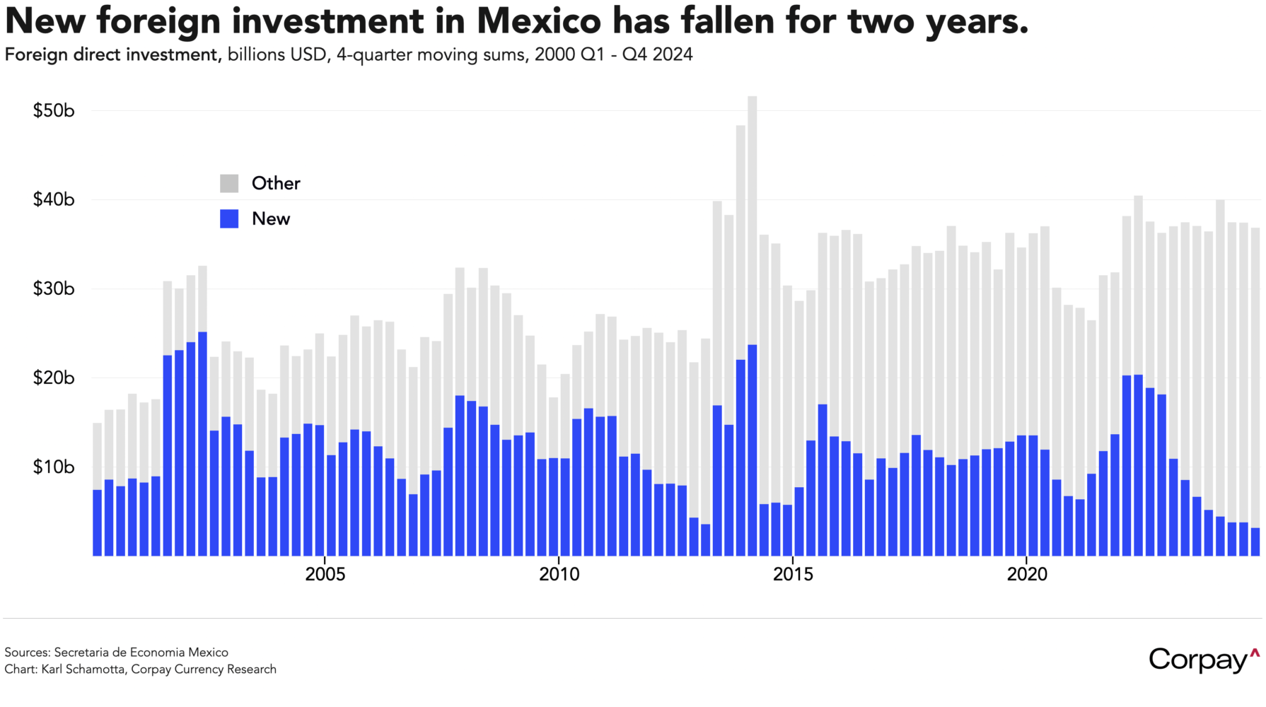 We’re skeptical. Although dozens of businesses have announced ambitious plans in recent years, the vast majority of foreign direct investment in Mexico has come through the reinvestment of revenues from existing enterprises. New investment dropped sharply in 2024, falling by 34 percent in year-over-year terms to its lowest levels since the mid-nineties as domestic political turbulence, poor infrastructure, and trade threats from the United States intersected to dampen international appetite for large projects. Looking ahead, it seems unlikely that these concerns will be fully alleviated—or that foreign automakers will make multi-decade investment shifts—given the Trump administration’s propensity for changing direction on trade policy. The peso could struggle to make further headway.