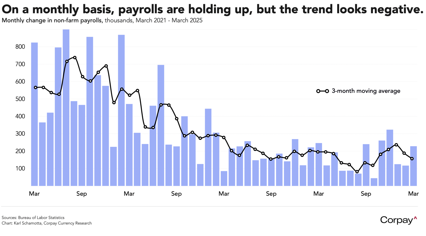 Today’s labour market data show the US job creation engine remaining strong, but still losing momentum. According to numbers just released by the Bureau of Labor Statistics, 228,000 new roles were created in the month of March, overshooting estimates for a gain closer to the 140,000 area, but the prior month’s gain was revised down to 117,000, driving a sharp decline in the three-month average rate of job creation. The unemployment rate edged up to 4.2 percent and average hourly earnings climbed 3.8 percent in year-over-year terms, down from 4.0 previously. We think job markets will soften further in the months ahead, and suspect that Federal Reserve chair Jerome Powell will acknowledge a worsening outlook for employment, growth, and inflation when he speaks in Arlington, Virginia later this morning, even as he remains committed to taking a wait-and-see approach to policymaking.