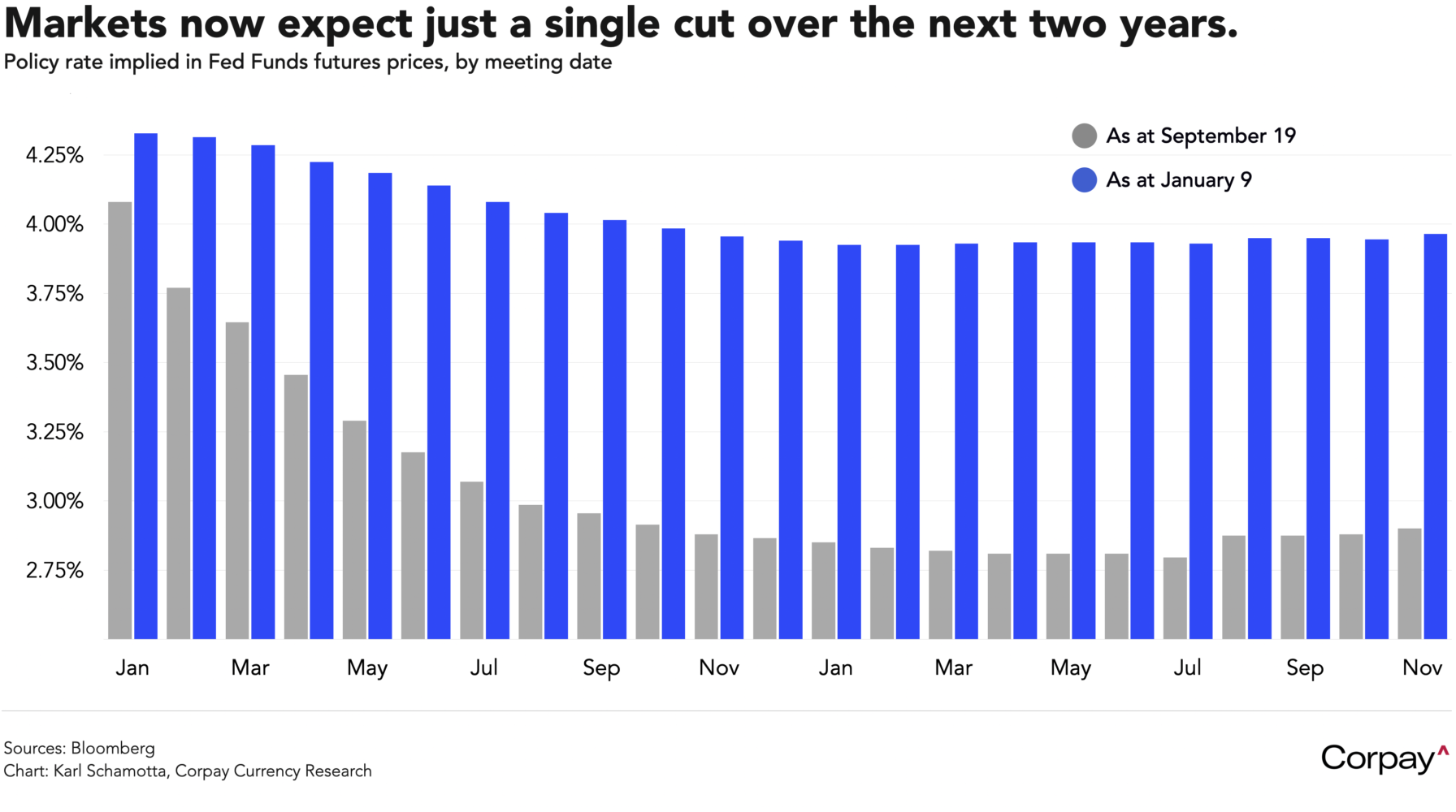 A series of better-than-expected economic data releases—paired with growing fears surrounding the incoming Trump administration’s impact on inflation—have lifted US yields in recent weeks, widening cross-currency rate differentials even as global borrowing costs have moved higher. With the economy performing well, underlying price pressures proving stubbornly strong, and tariff threats driving a front-running process among American corporates, expectations for rate cuts from the Federal Reserve have been pulled dramatically lower, with market participants now expecting just a single move over the coming two years.