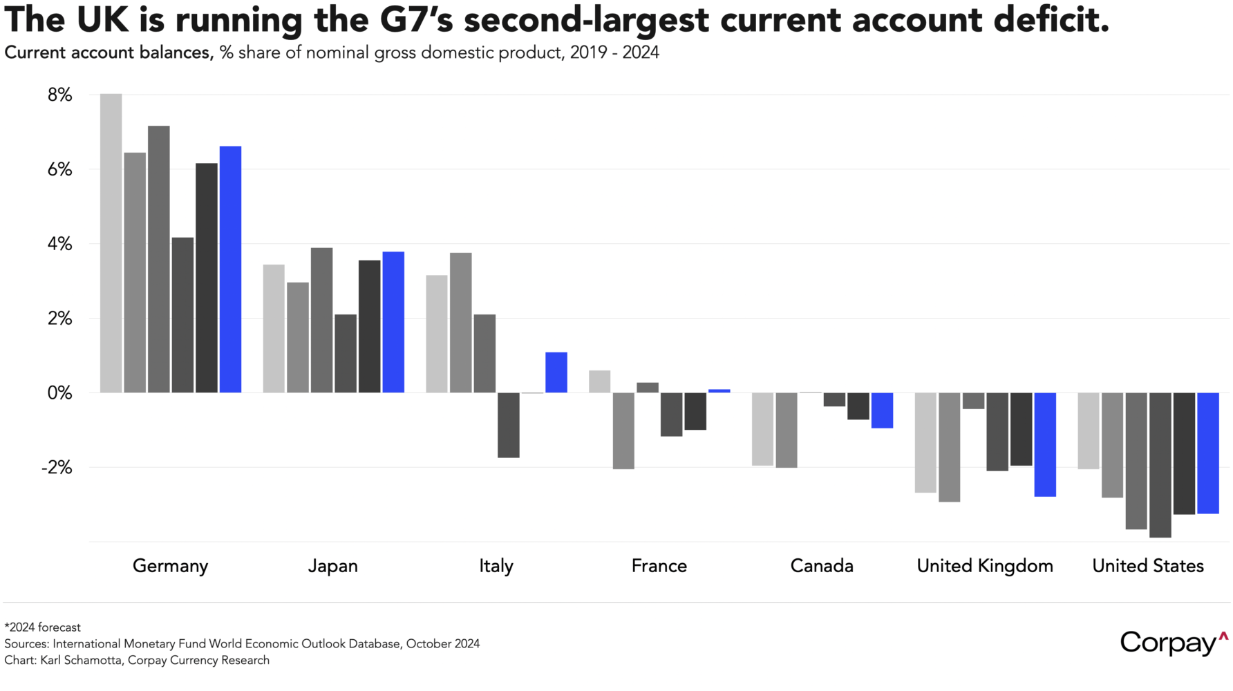 Moves in British financial markets are drawing uncomfortable comparisons with the budget debacle that ended Liz Truss’s brief stint as prime minister. To our knowledge, no one is yet live-streaming the deterioration of a lettuce, but a simultaneous sell-off in fixed income and foreign exchange markets—something more typical of emerging market crises—has seen the government’s 10-year borrowing costs rise to the highest levels since the global financial crisis even as the pound has fallen to a two-year low. It’s difficult to quantify the reasons behind this idiosyncratically-extreme reaction to the turmoil currently unfolding in global bond markets, but we think the country’s unique vulnerabilities—a stagflationary economic outlook and negative balance of payments—have exacerbated the move. The United Kingdom ran the second-largest current account deficit, as a percentage of gross domestic product, among G7 countries in 2024, but without the privileges which accrue to the country with the largest deficit: the United States. Being the global hegemon has its privileges.