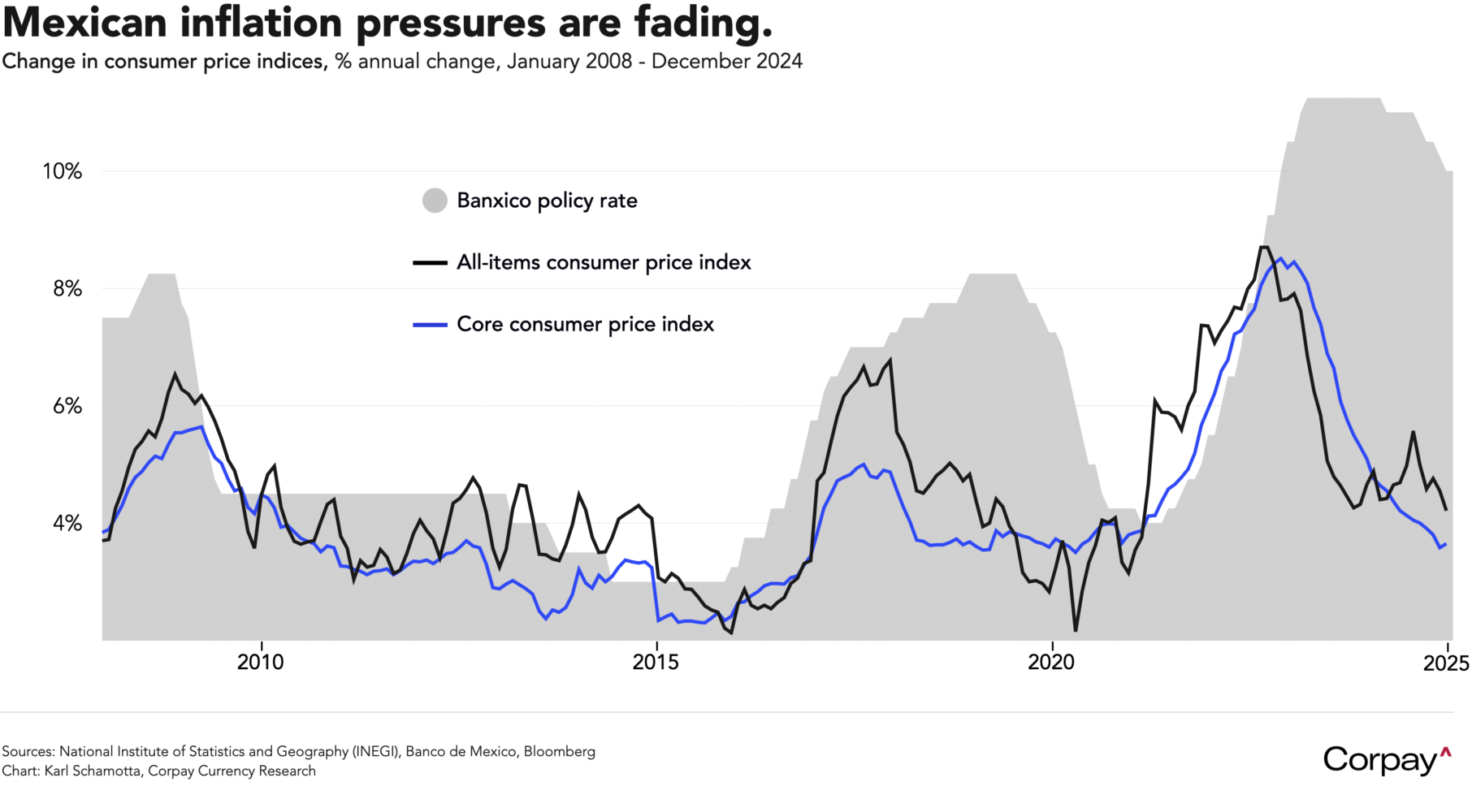 The Mexican peso is coming under modest selling pressure after the national statistics agency said inflation fell to a three-year low in December, helping bolster odds on a fifth consecutive rate cut at the central bank’s next meeting. Consumer prices climbed 4.21 percent on a year-over-year basis while a core measure—which excludes highly-volatile food and energy categories—accelerated slightly to 3.65 percent, remaining only slightly above the country’s official 3-percent inflation target. Officials are widely expected to cut the benchmark cash rate to 9.75 percent on February 6, reducing the extent to which high borrowing costs restrict economic growth, while also maintaining a wide buffer in real terms over US Treasuries. This could be needed to keep the exchange rate supported in the event that Donald Trump follows through on campaign trail promises to impose significant tariffs on Mexico.