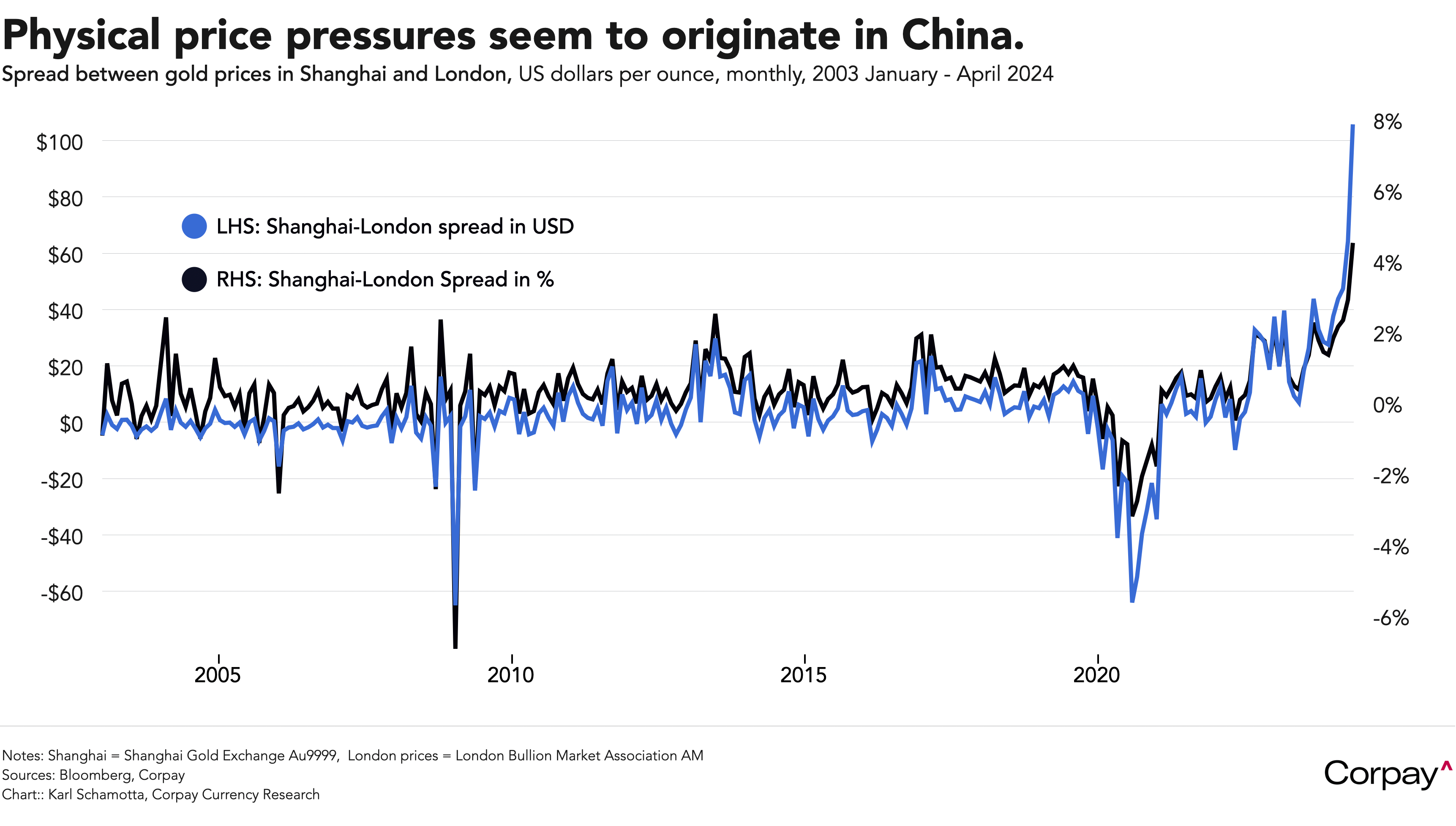 On a side note: Gold prices are marching higher as tensions in the Middle East threaten to boil over and inflation worries resume. Or they seem to be. Other indicators of risk aversion are hardly pointing to a high level of global concern over the conflict between Israel and Iran, and inflation breakevens still suggest that investors see price growth reverting to normal over the coming years. With the caveat that I’m not a gold market expert, and could very well be missing something fundamental in how the physical market is functioning, it seems more likely that a form of capital flight is taking place in China. The spread between gold prices in Shanghai and London, when adjusted for exchange rate depreciation, has blown out to record levels when viewed on a monthly basis: