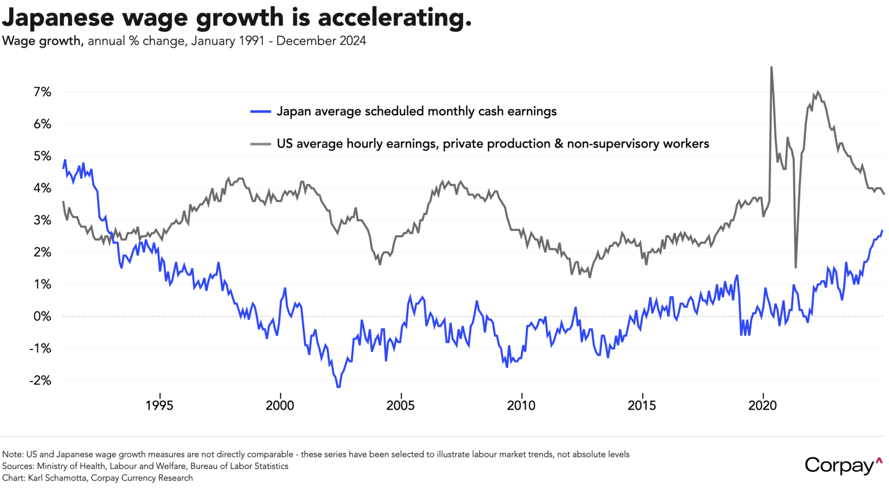 *Please note that US and Japanese wage growth measures are not directly comparable. I selected these series to illustrate underlying trends, not absolute values.