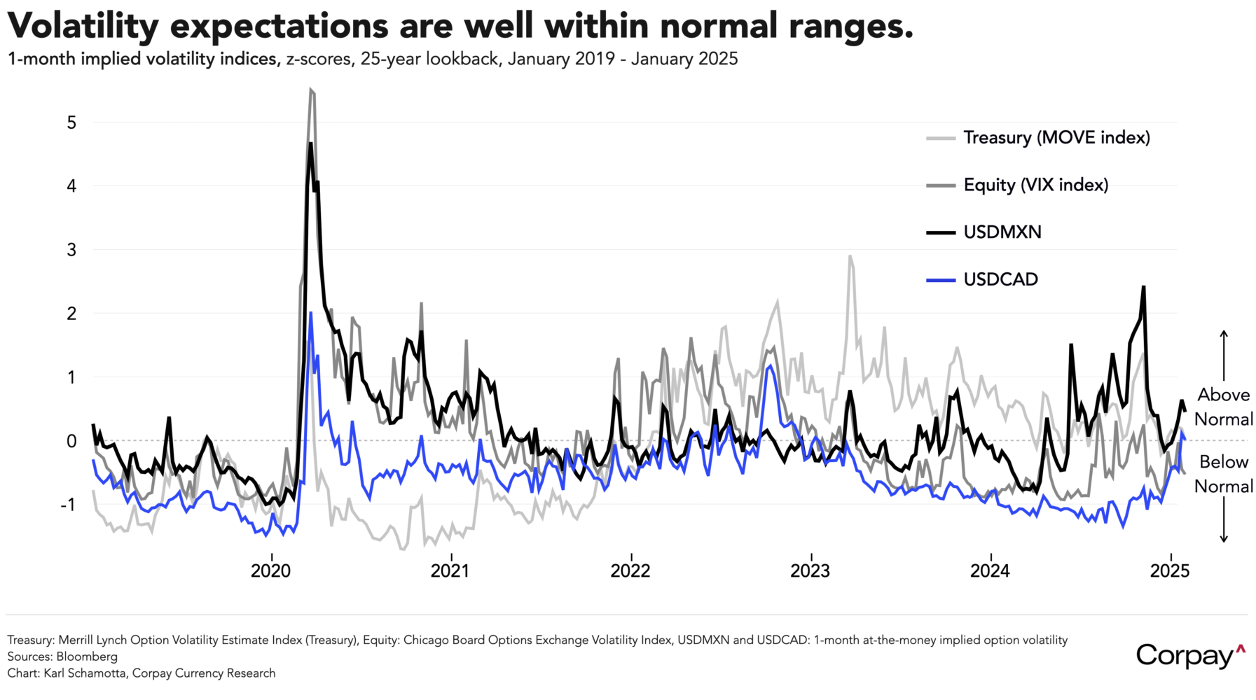 **Z-scores measure how far above the historical mean a given value is. At the moment, all four of our selected volatility measures—the VIX, MOVE, USDMXN, and USDCAD option values—are within 1 standard deviation of their 25-year norms.