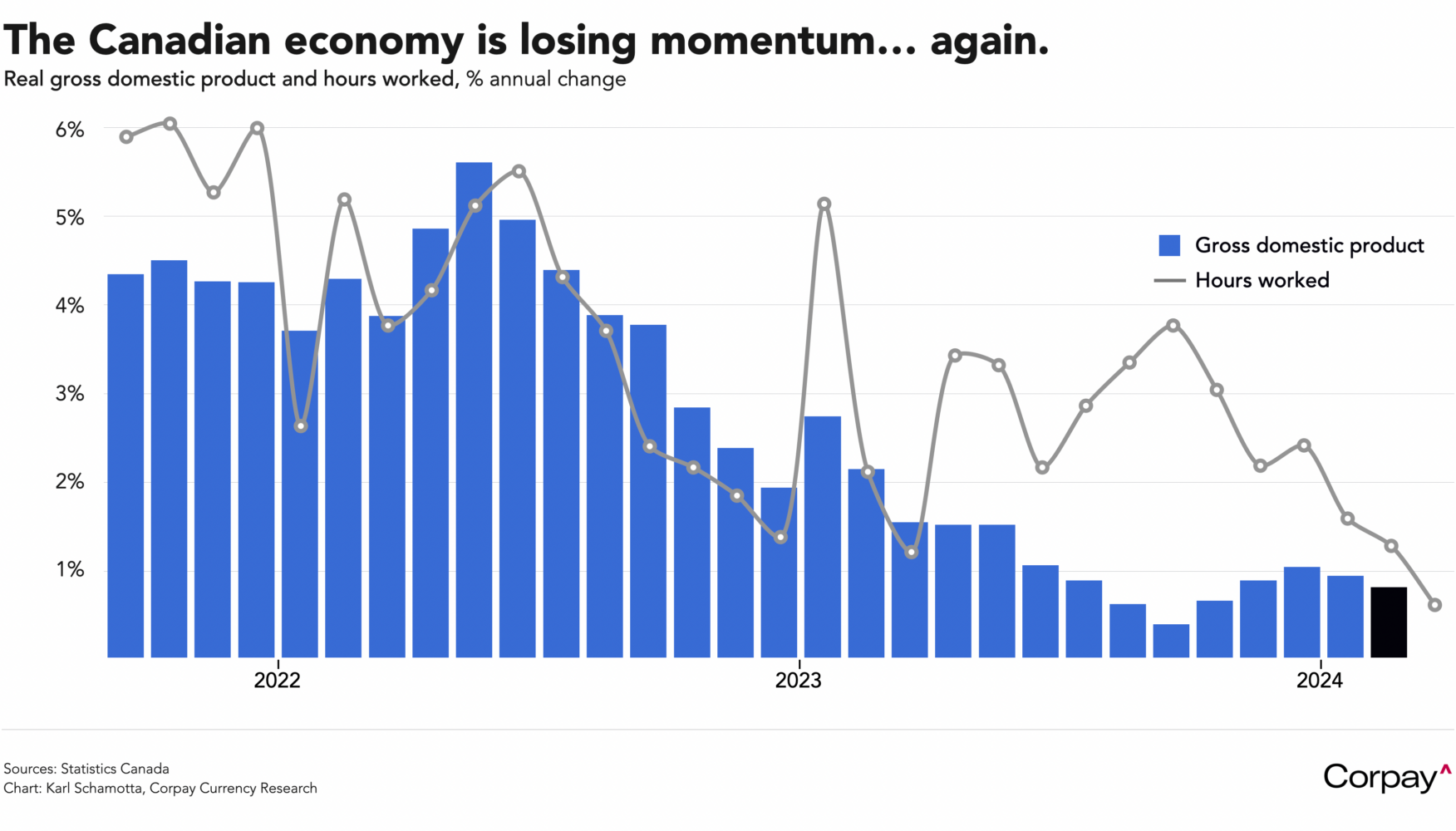 The Canadian economy ran out of momentum toward the end of the first quarter, helping bolster market-implied odds on an imminent pivot to easing by the Bank of Canada. Numbers released by Statistics Canada this morning show real gross domestic product missing forecasts with a 0.2 percent expansion in February, following a downwardly-revised 0.5-percent expansion in January.