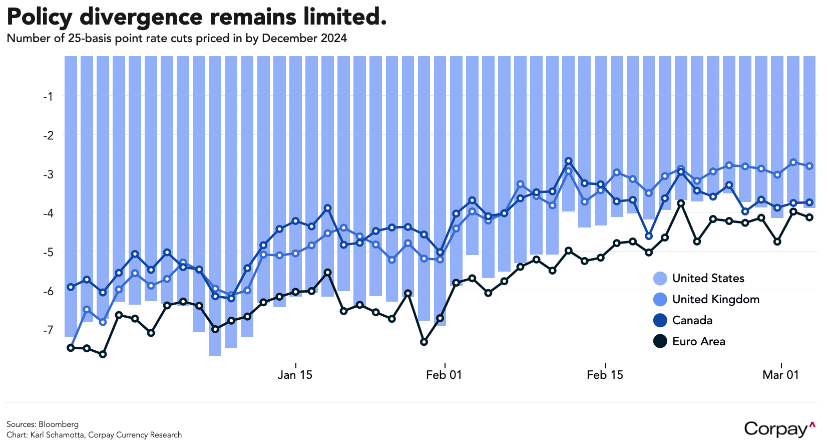 Gaps between the major central banks have remained relatively static since the beginning of the year, and the degree to which rate expectations have moved in lockstep has reduced volatility in the currency markets. After a broad-based hawkish reappraisal of global growth and inflation risks, investors now have 3.4 rate cuts priced in for the Fed by year end, with 3.6 expected from the European Central Bank, 3.1 from the Bank of Canada, and 2.5 from the Bank of England.