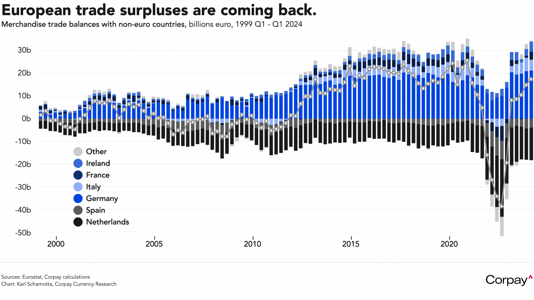 The euro is struggling to make headway against the dollar despite an ongoing improvement in underlying fundamentals. Data out this morning showed the bloc recording a goods trade surplus of 57.5 billion euro in the first quarter, up from -9.4 billion in the same period last year, with a -12.3-percent drop in imports fully offsetting a -3.2 percent decline in exports as energy costs came down. The exchange rate remains stuck within a remarkably-tight trading range, and there are no obvious catalysts for a breakout on the calendar this month – but the European Central Bank could pair a well-telegraphed June rate cut with some unexpectedly cautious guidance on future easing, helping to push the common currency back through the 1.10 threshold to the upside at some point.