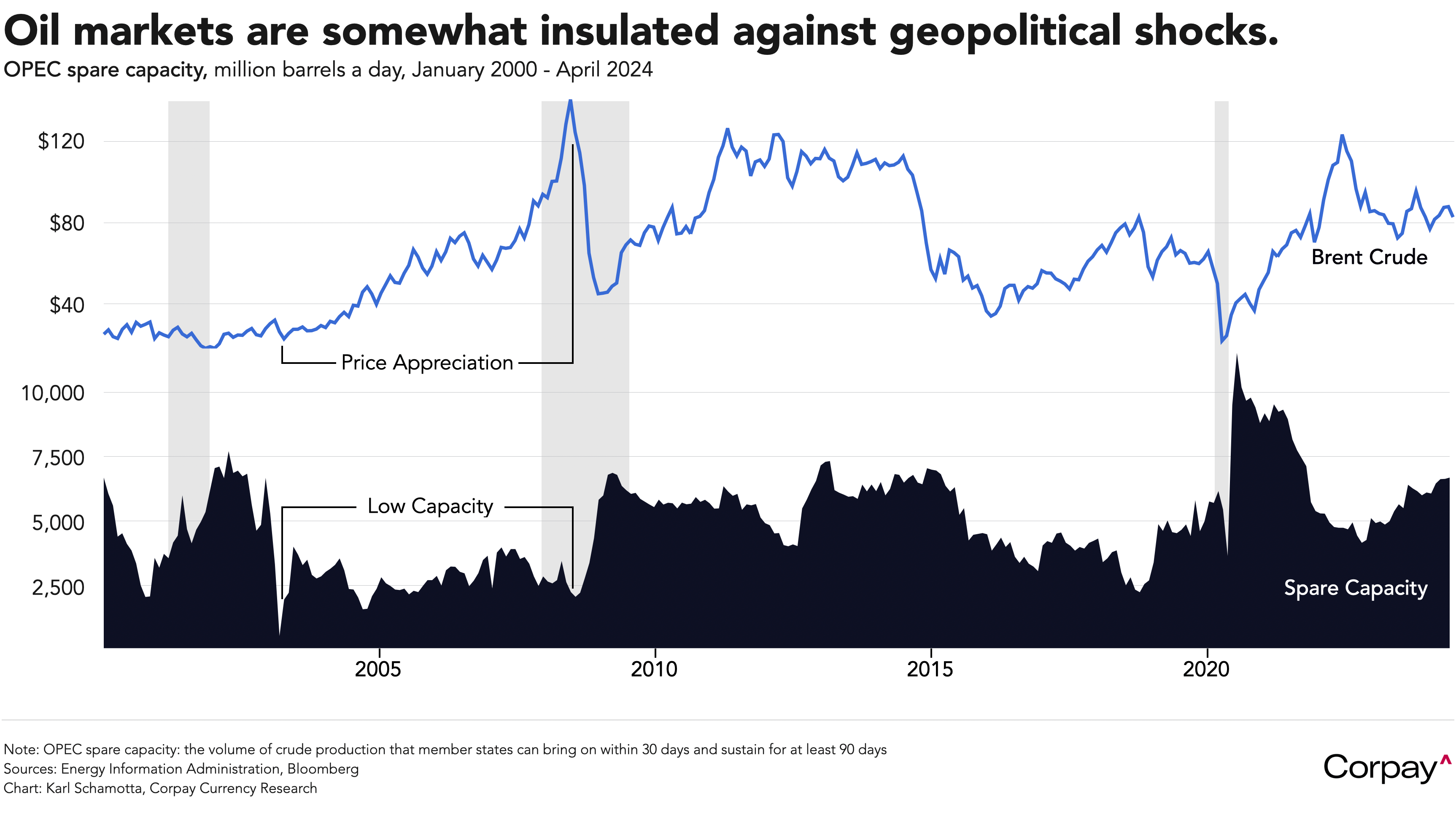 Aftershocks from the killing of Iranian president Ebrahim Raisi in a weekend helicopter crash are gradually fading in oil markets, with both major global benchmarks now roughly unchanged relative to Friday’s levels. Few expect the balance of power in the Middle East to shift dramatically, and elevated spare capacity levels within the OPEC cartel are helping numb markets to geopolitical risks. History suggests that the supply risk premium built into oil prices tends to fall when producers are capable of responding to potential crises – and sustained rallies are unusual during periods when unused output is high.