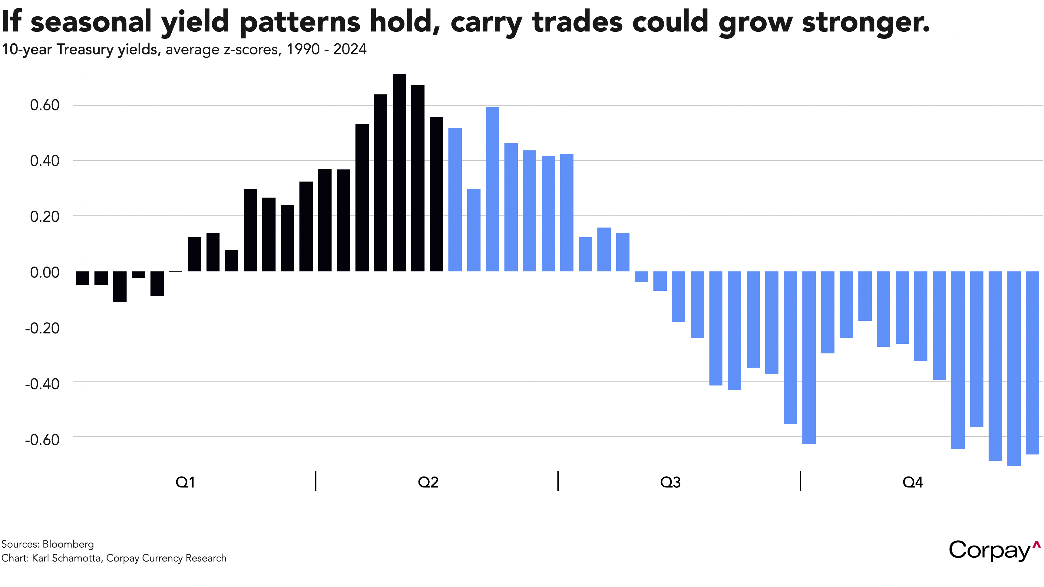 In the background, Treasury yields seem to be following typical seasonal dynamics, declining as outdoor temperatures heat up. The tendency for yields to fall between May and October – and to rise between November and April – has been documented in data back to the early fifties, and research published by the Critical Finance Review in 2015 showed that this “ does not arise due to macroeconomic seasonalities, seasonal variation in risk, cross-hedging between equity and Treasury markets, conventional measures of investor sentiment, the weather, seasonalities in the Treasury market auction schedule, seasonalities in the Treasury debt supply, seasonalities in the Federal Open Market Committee cycle, or peculiarities of the sample period considered”. Instead, “it is correlated with a proxy for variation in risk aversion linked to seasonal mood changes” – something familiar to currency traders, who have long observed a propensity for implied volatility levels to subside in the summer months and climb in the autumn. If this pattern holds, “carry trades” – in which funds are borrowed in low yielding currencies such as the Japanese yen, and invested in high-yielding alternatives like the Mexican peso – could gain momentum in the near term.