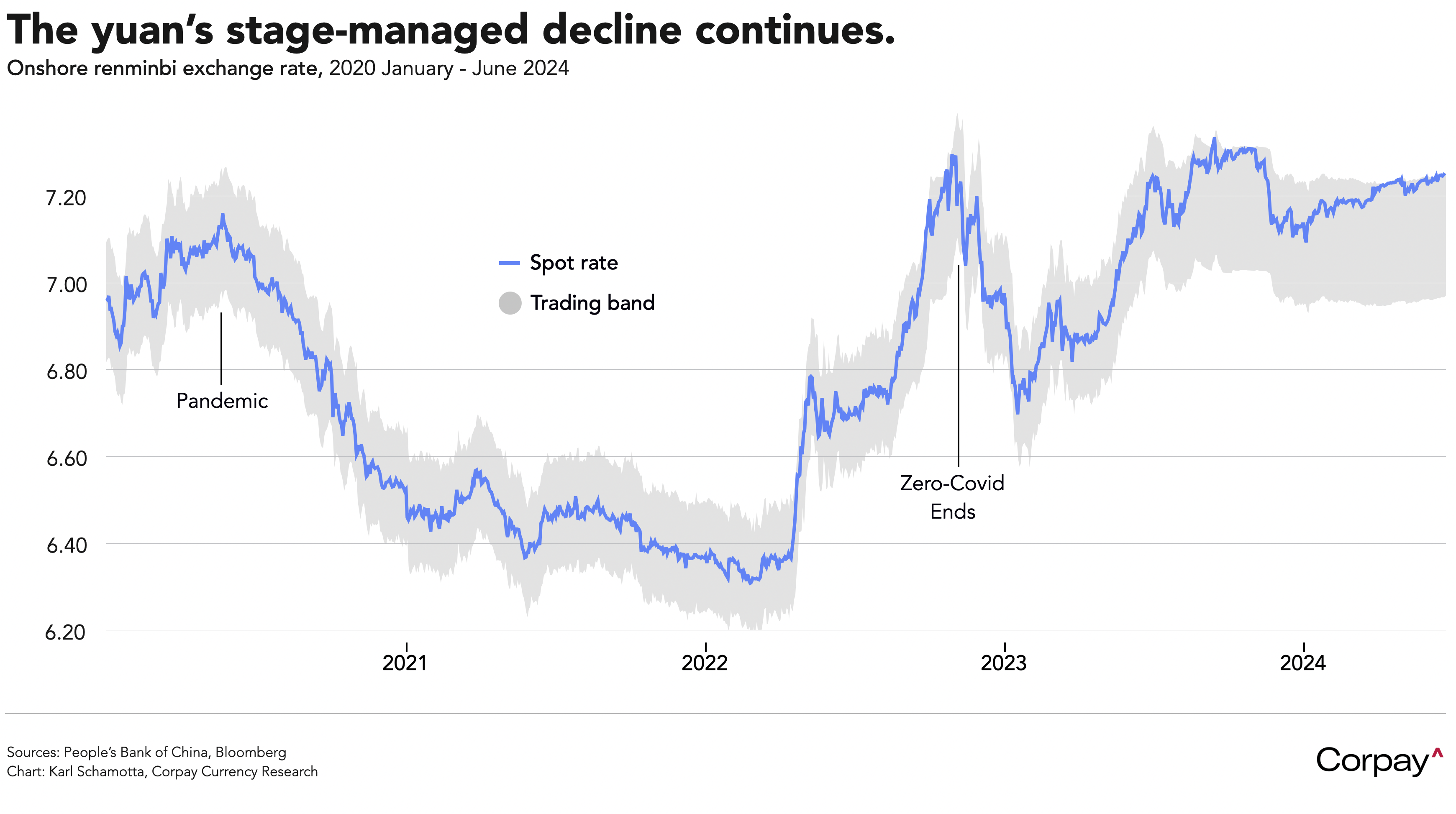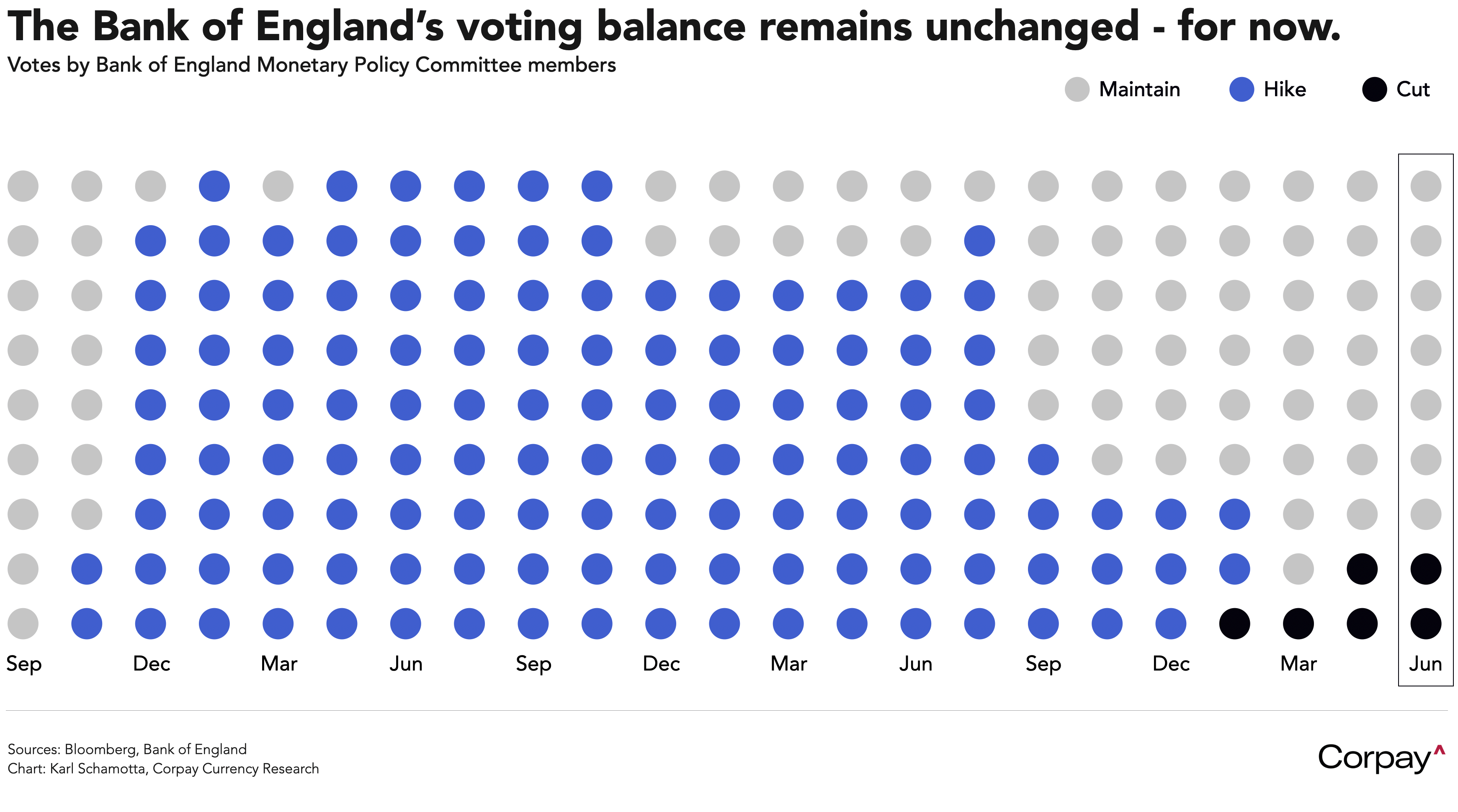 The pound is trading with a weaker bias after the Bank of England hinted at an imminent shift onto a more accommodative footing – increasing the likelihood of an August move – even as it kept policy settings unchanged in its latest decision. Just two members of the Bank’s policy committee – Swati Dhingra and Deputy Governor Dave Ramsden – again backed a cut, but the meeting record described the decision for the other seven as “finely balanced,” implying that more data could push the majority toward easing rates in August. In comments issued alongside an unchanged statement, Governor Bailey said “We need to be sure that inflation will stay low and that’s why we’ve decided to hold rates at 5.25 percent for now,” triggering a near-doubling in odds on a rate cut at the August decision – from below 30 percent to almost 60 percent.