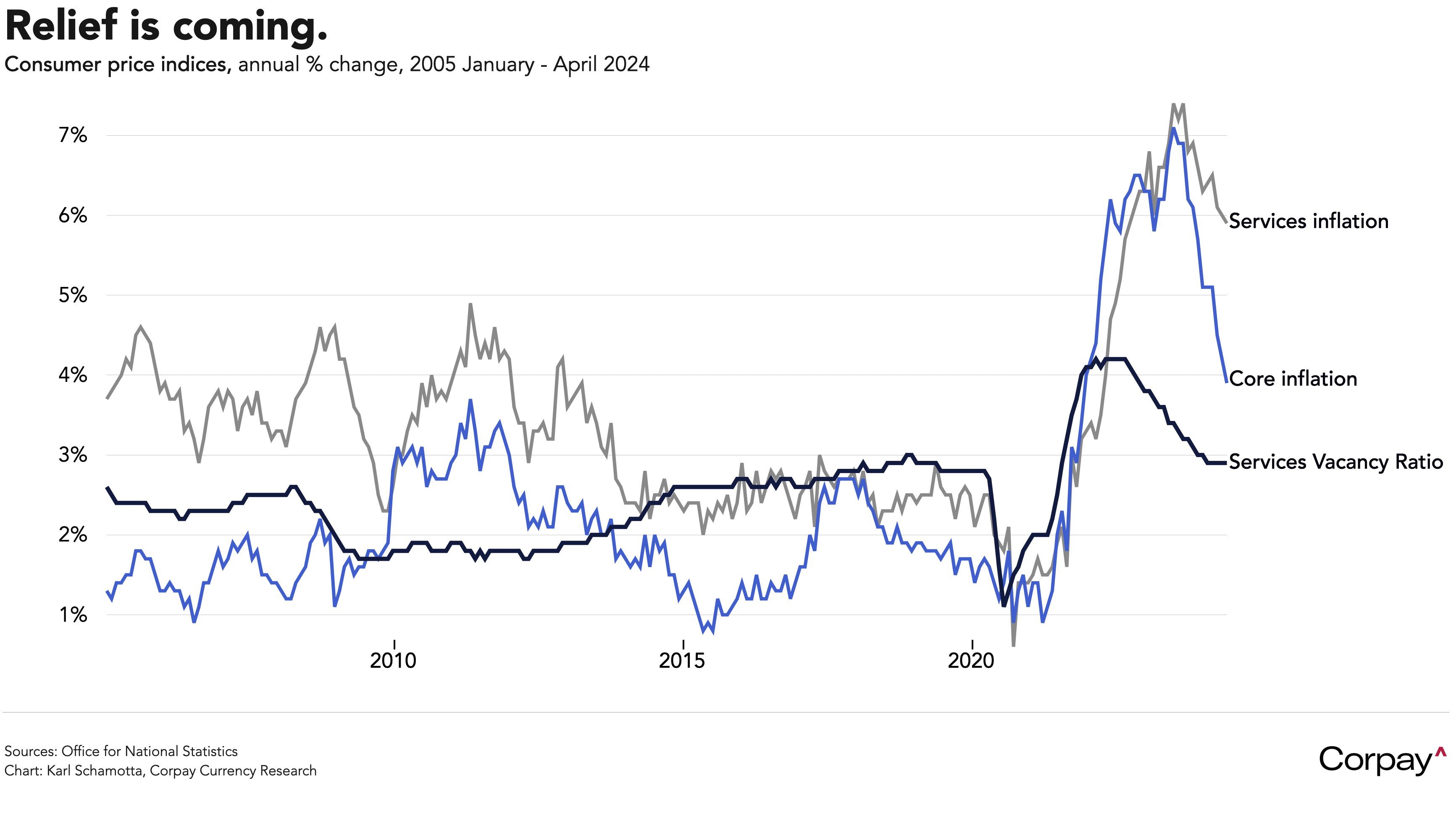 Data out yesterday showed headline inflation hitting the Bank’s target for the first time since the spring of 2021, but price growth in the services sector remained uncomfortably high at 5.7 percent year over year, 0.4 percent above the forecast embedded in the May Monetary Policy Report. With another consumer price index report due before the Bank meets in August, we suspect that relief is coming: the vacancy-to-unemployment ratio in services – which typically foreshadows changes in wage growth – is pointing to softness ahead, and a range of other indicators are suggesting that salary demands are easing. It seems many policymakers are of a similar bent, with the meeting minutes saying “The upside news in services price inflation relative to the May report did not alter significantly the disinflationary trajectory that the economy was on”.