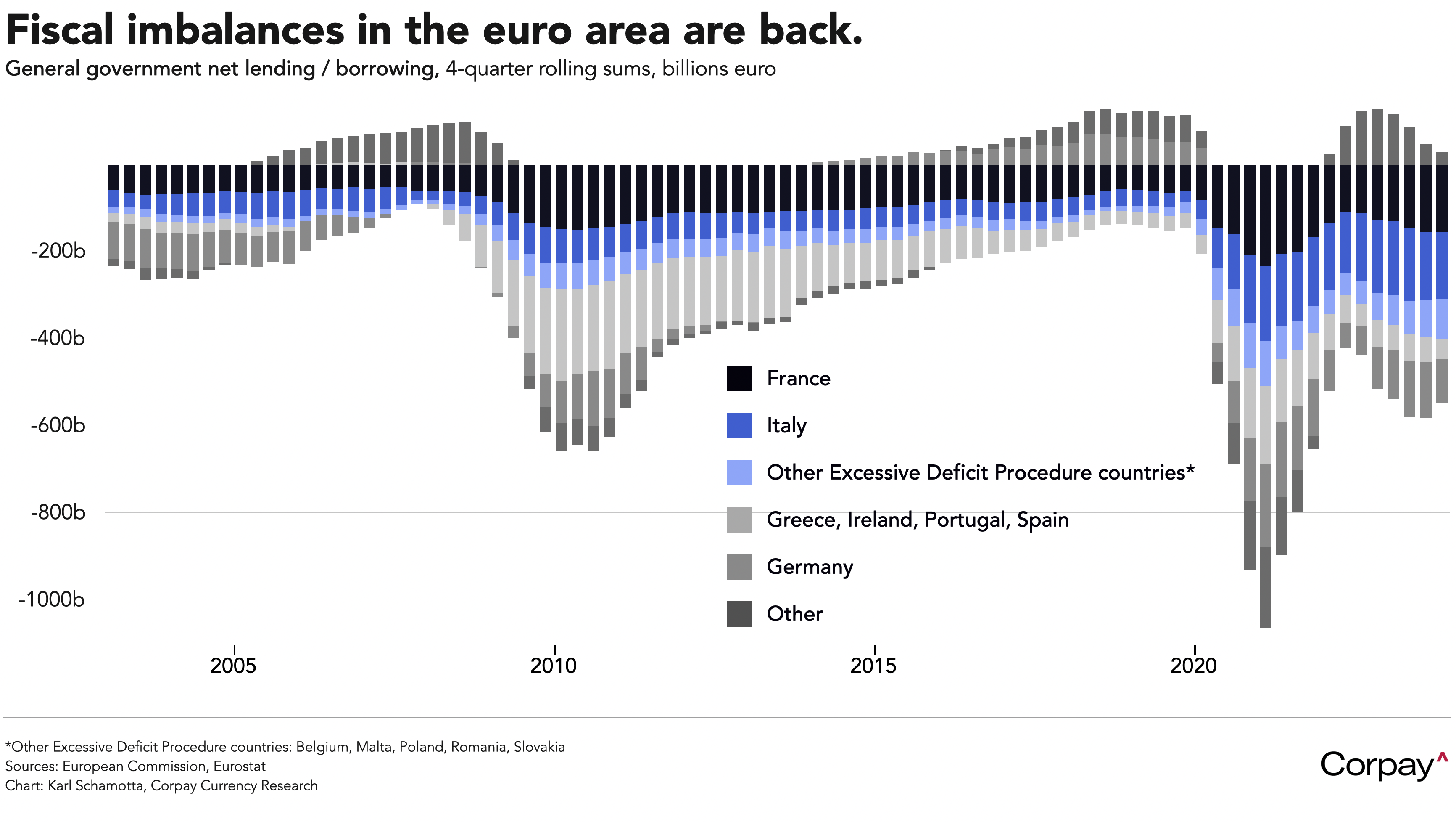 We doubt the Commission’s efforts at shaming governments will do much to shift the political calculus in the upcoming French legislative election. The Excessive Deficit process can theoretically lead to fees amounting to 0.05 percent of gross domestic product, and ineligibility for protection under some of the European Central Bank’s bond-buying programmes, but parties on both ends of the French political spectrum – the right-wing National Rally and the left-wing New Popular Front – have outlined plans that would likely take debt even higher, suggesting that they don’t take the these penalties terribly seriously. Fiscal discipline is beginning to make a comeback across the wider euro bloc, but big differences between government deficit levels – as depicted below – mean that stresses will continue to build within the common currency area.