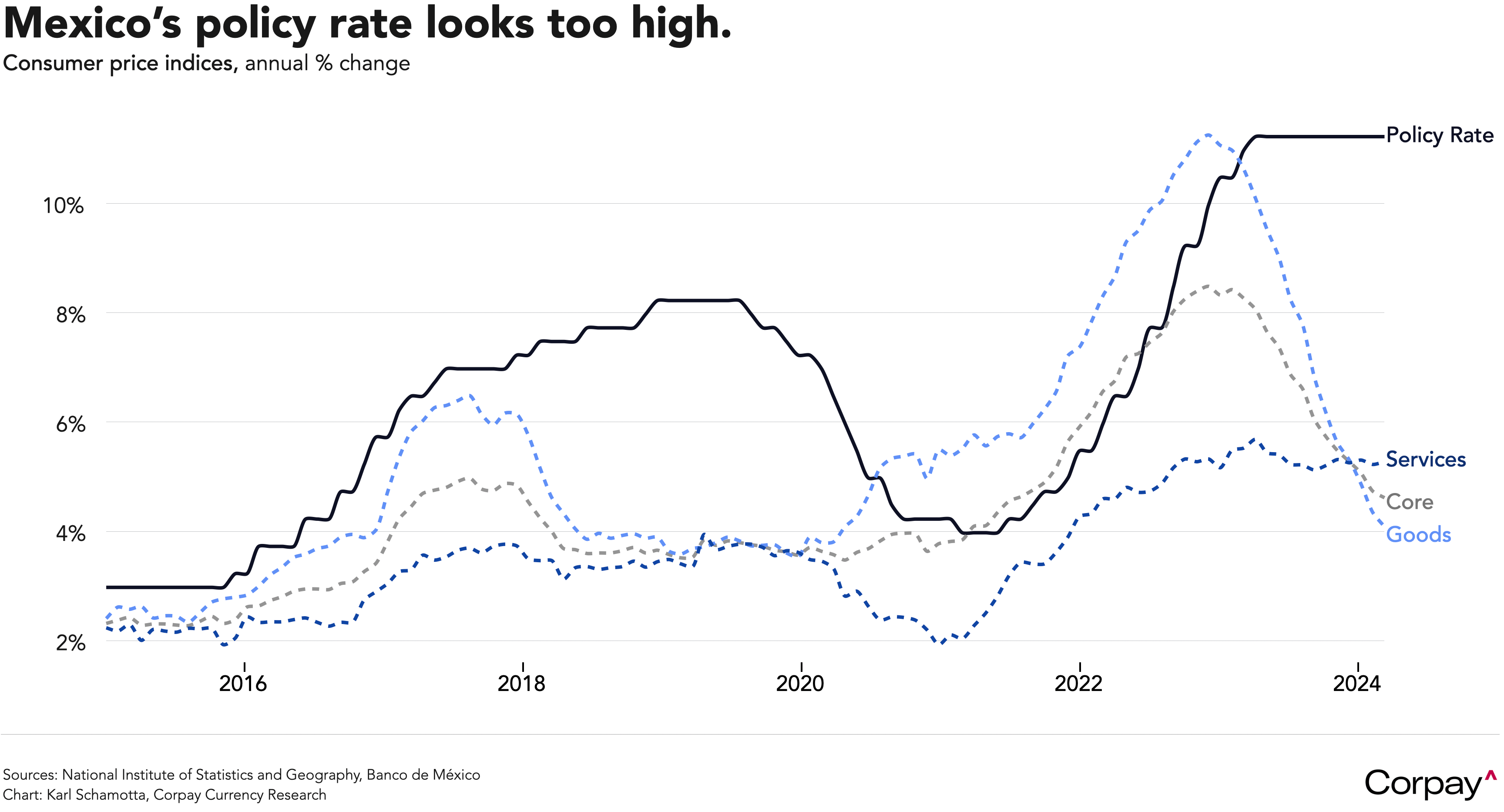 Officials at the Banco de Mexico could vote by a narrow margin to cut key interest rates for the first time in three years, but should stick with guidance that sets out an extremely gradual easing trajectory ahead. With inflation subsiding at a rapid clip, Mexican real interest rates are the highest in Latin America, imposing a speed limit on the economy, while also helping support the carry trade that has made the peso one of the world’s best-performing currencies in the last few years. (15:00 EDT)