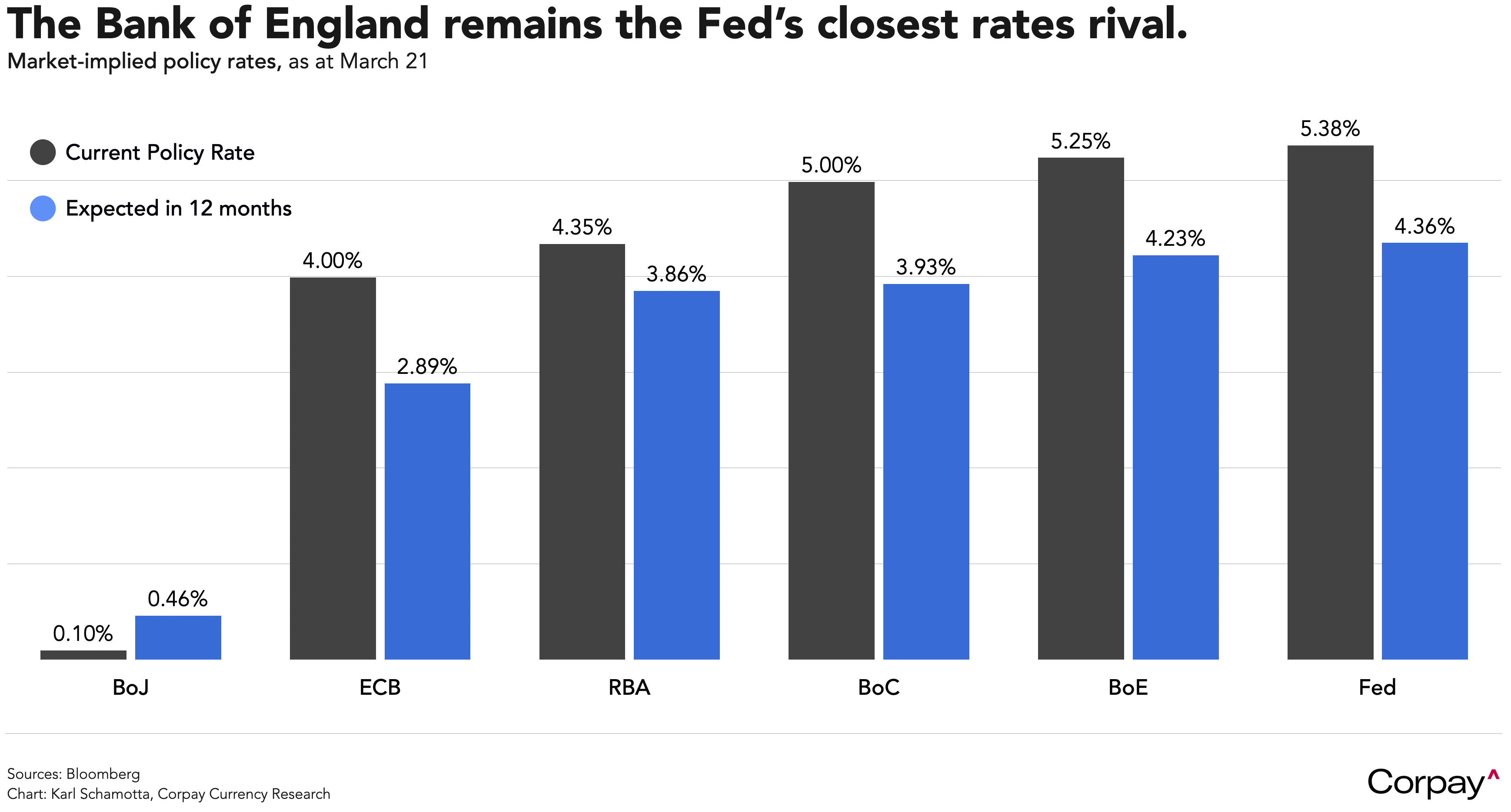 The Bank of England left its main policy rate unchanged a day after new data showed inflation falling to a two-and-half year low even as it remained well above target. With inflation now projected to fall to slightly below the 2 percent target in the second quarter, members of the Monetary Policy Committee turned more dovish. Eight voted to keep rates stable, and one – very likely Swati Dhingra – opted for a cut. At February’s meeting, two of nine members voted for a hike, one for a cut, and six for a hold. Gilt yields are tumbling and the pound is slipping as we go to print, but the Bank remains the only real rival for the Fed’s projected yield trajectory among the majors, meaning that losses should be relatively limited.