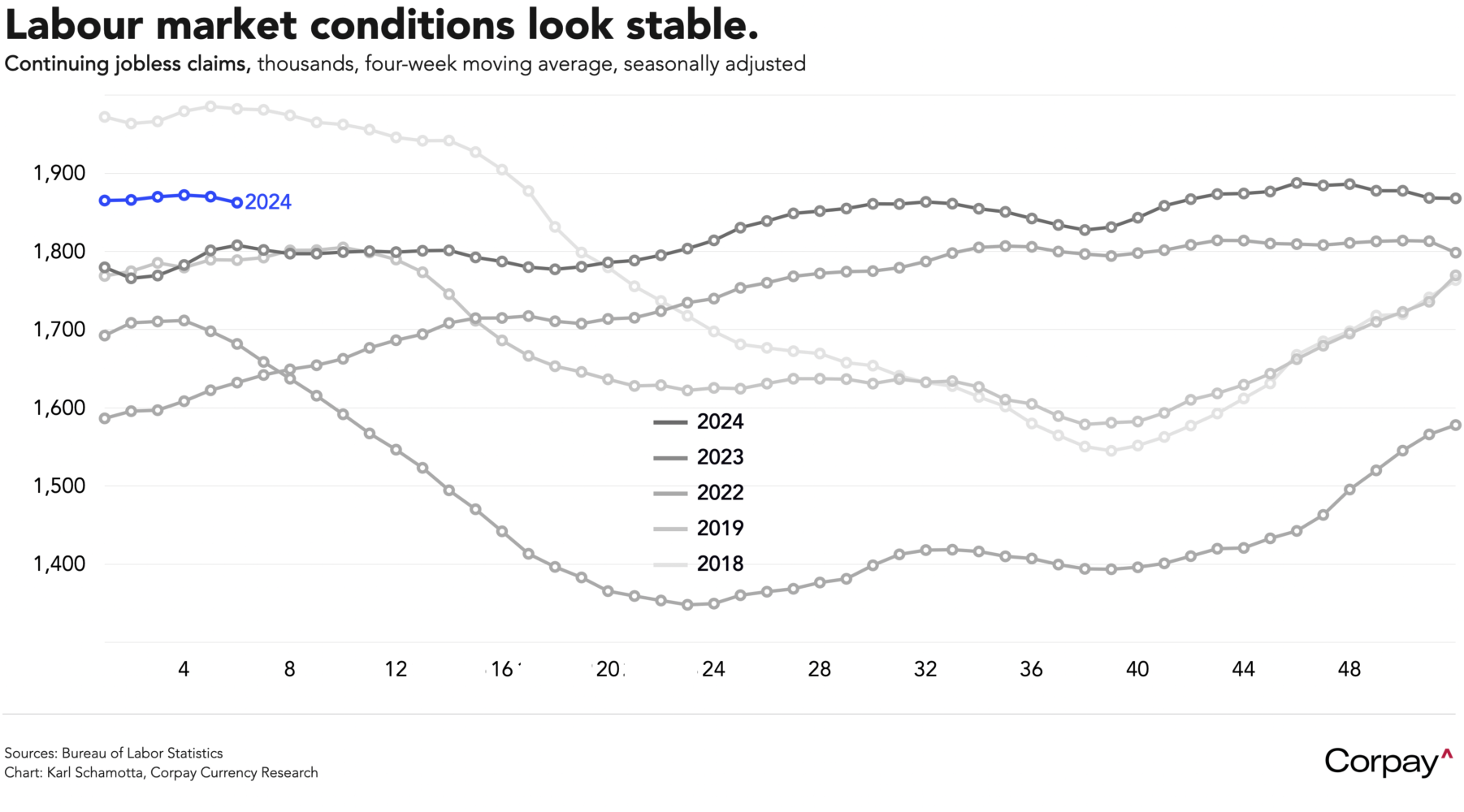 Labour market conditions look stable. The number of Americans filing initial applications for unemployment benefits inched higher to 219,000 in the week ended February 15—roughly consistent with pre-pandemic averages—and 1,869,000 continuing claims were submitted for the week ended on the 8th, bringing the four-week moving average down to 1,862,000. Job cuts made by Elon Musk’s ‘Department of Government Efficiency’ may show up in the coming weeks, but haven’t had a visible impact thus far outside Washington DC, with fewer than 25,000 roles believed to have been eliminated.