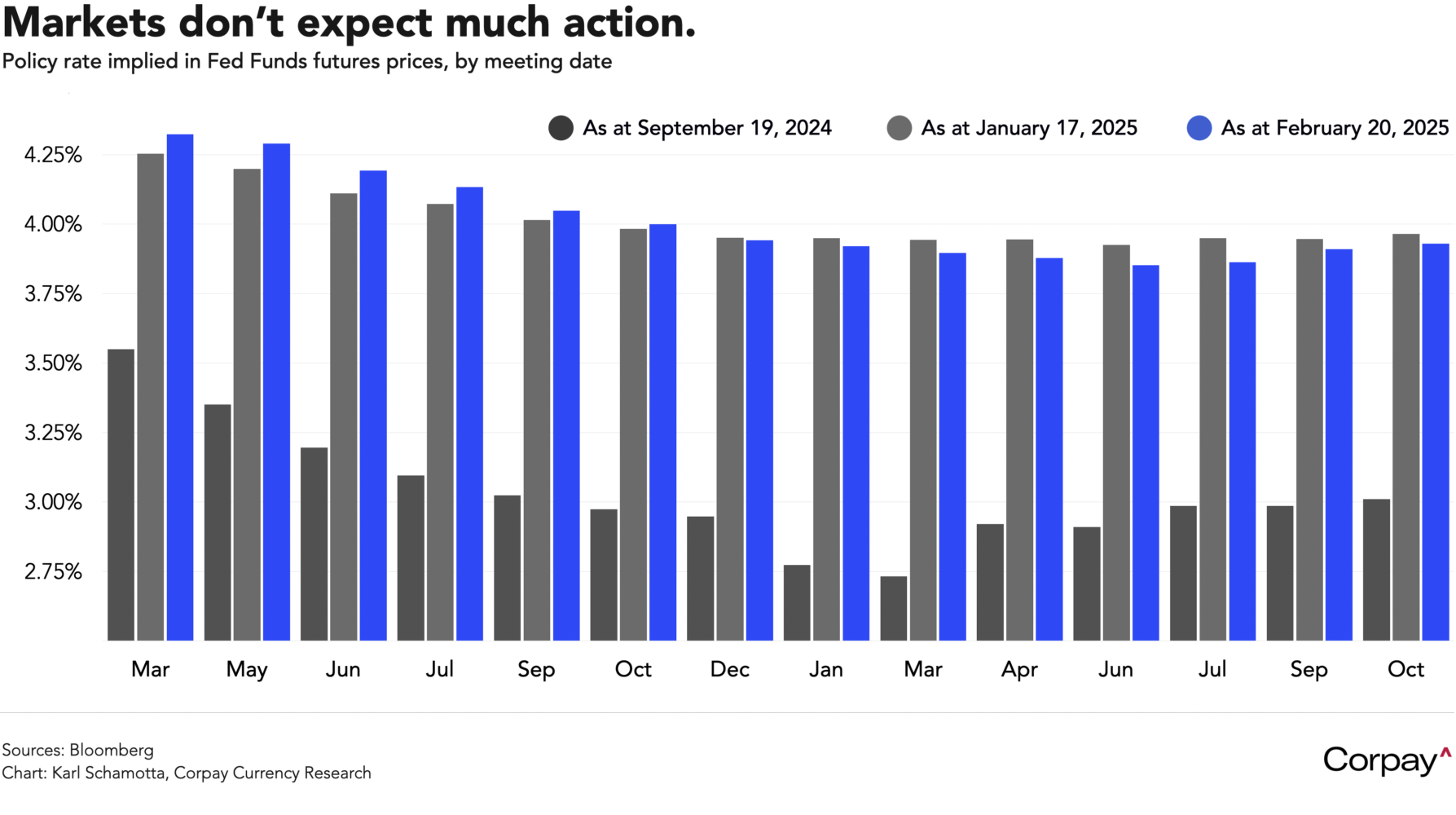 Markets are positioned for a long stay on the sidelines. The Fed is seen easing slightly more than had been expected in the days running up to Trump’s inauguration, but there are just two rate cuts fully priced in by the end of next year, implying a far less aggressive adjustment than was anticipated when the central bank began moving in September.