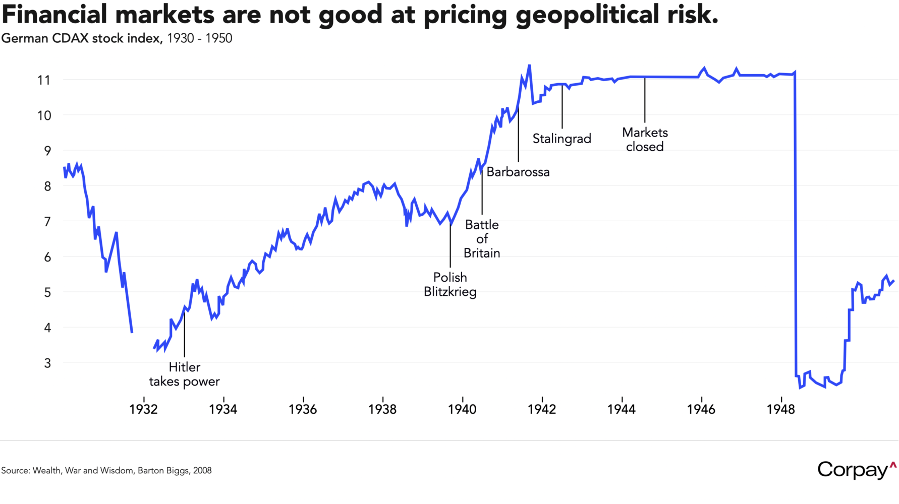 But the reality is that markets are terrible at pricing geopolitical risks. Today’s situation (hopefully) isn’t directly comparable, but the classic chart reproduced below—from Barton Bigg’s ‘Wealth, War and Wisdom’—illustrates how the value of the German stock market soared after the Nazis seized power, kept climbing through the long period of massive militarisation that led up to the Second World War, and remained elevated well after Hitler’s disastrous decision to invade Russia. From a practical perspective, political considerations should be avoided in conversations with barbers and bartenders, and largely kept out of investment and hedging decisions.