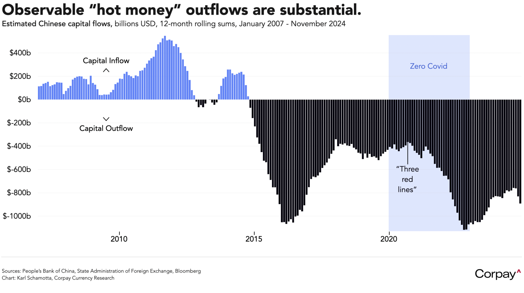 It’s difficult to measure precisely, but it is reasonable to assume that capital flight out of China is (again) playing a major role in global asset price movements. A rough proxy for financial flows across Chinese borders suggests that more than a trillion dollars left the country last year—and the scale could be much larger, with many households likely utilising semi-illicit means to stock up on “safe-haven” assets like gold and cryptocurrencies.