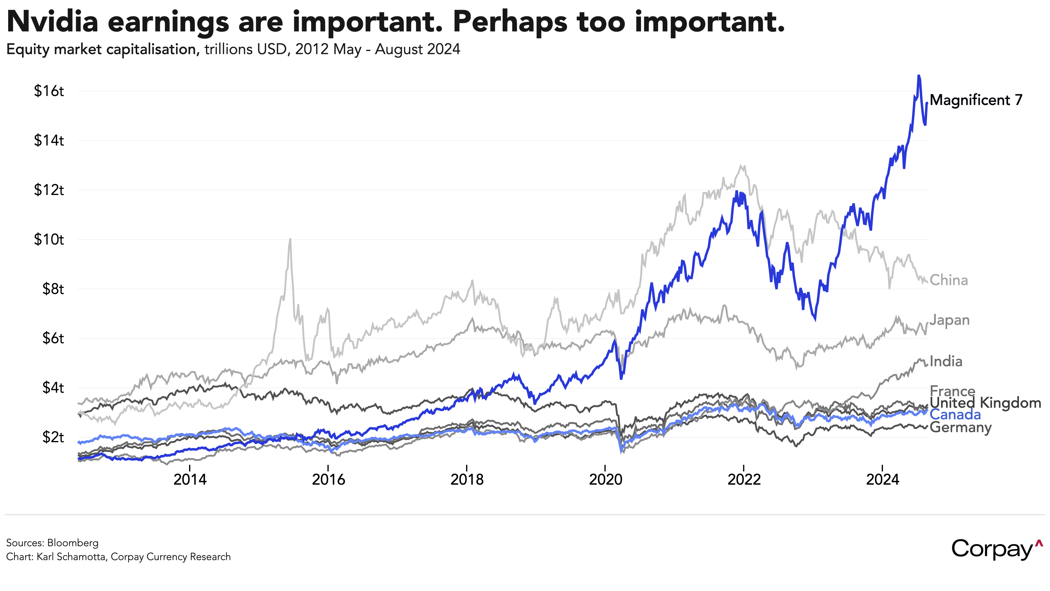 But Nvidia is slated to release its fiscal second-quarter results tomorrow afternoon, and high-beta currencies – like the Australian and Canadian dollars – are very likely to move in response as risk appetite shifts. The ‘magnificent seven’ stocks are – on paper – worth considerably more than any national equity market outside the US, and Nvidia has become a bellwether for the global capital investment cycle, making founder Jensen Huang something of a rock star (see debatably safe-for-work link here). We have no particular insight into how long this can be sustained, but there’s little doubt that investors will face an increasing risk of disappointment as time progresses.
