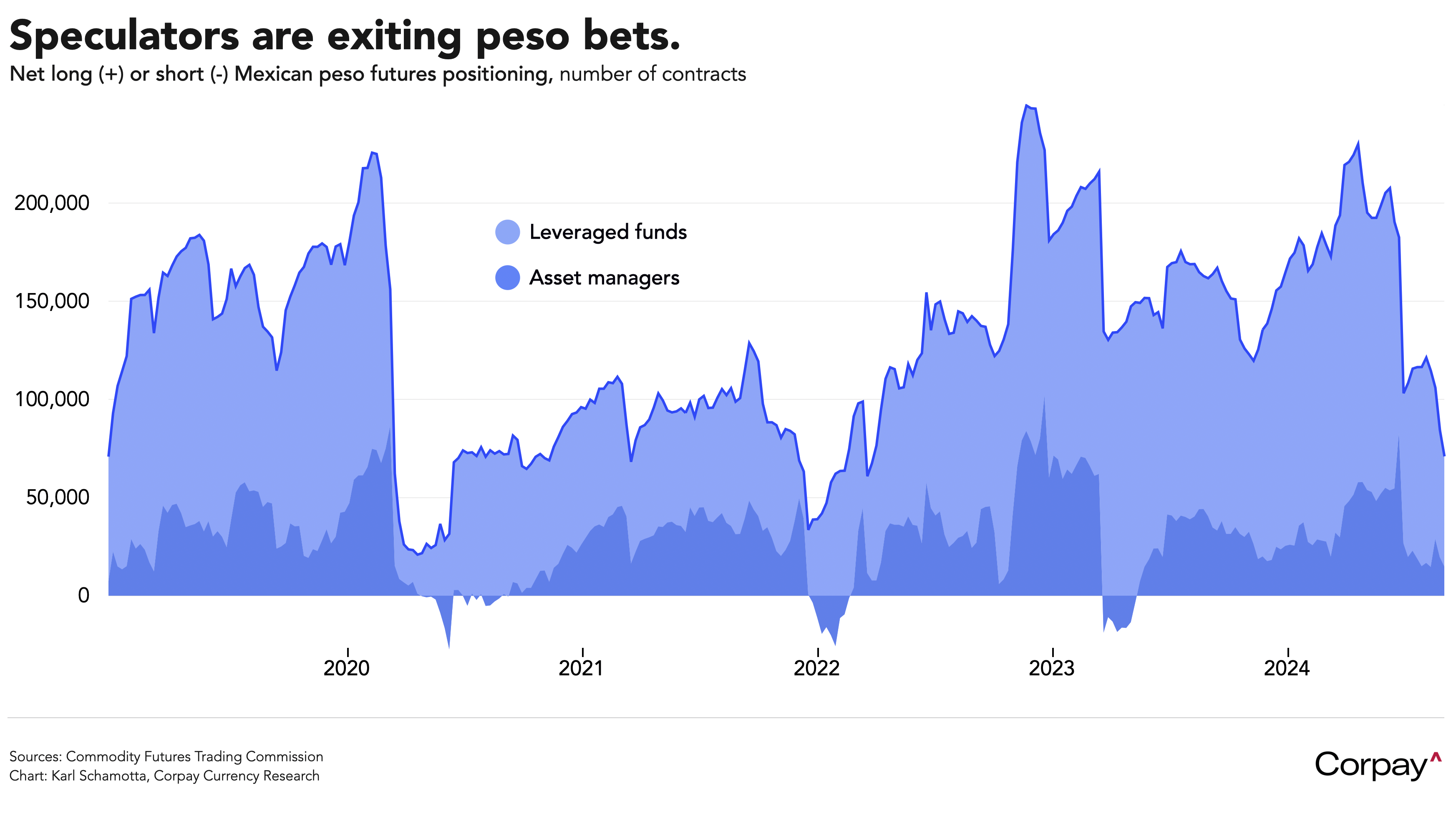 If Mexico follows suit, with China-focused tariffs then applied relatively consistently across the North American free trade zone, the peso could gain some lift – but this might not be enough to brighten the currency’s longer-term outlook. President Andrés Manuel Lopez Obrador’s effort to remake the country’s judicial system gained momentum yesterday, with a Congressional constitutional committee voting to advance a draft resolution that would require that all federal judges be elected by popular vote – a move that is widely viewed as likely to diminish legal independence and remove checks and balances on the government’s power. With infrastructure issues hobbling investment, “friend-shoring” narratives losing momentum, and fiscal concerns growing, the peso has struggled to hold gains in the last month, and speculative positioning on the currency has fallen sharply. Further unwinding seems likely in the weeks ahead if background volatility rebounds and funding currencies like the yen appreciate against the dollar.