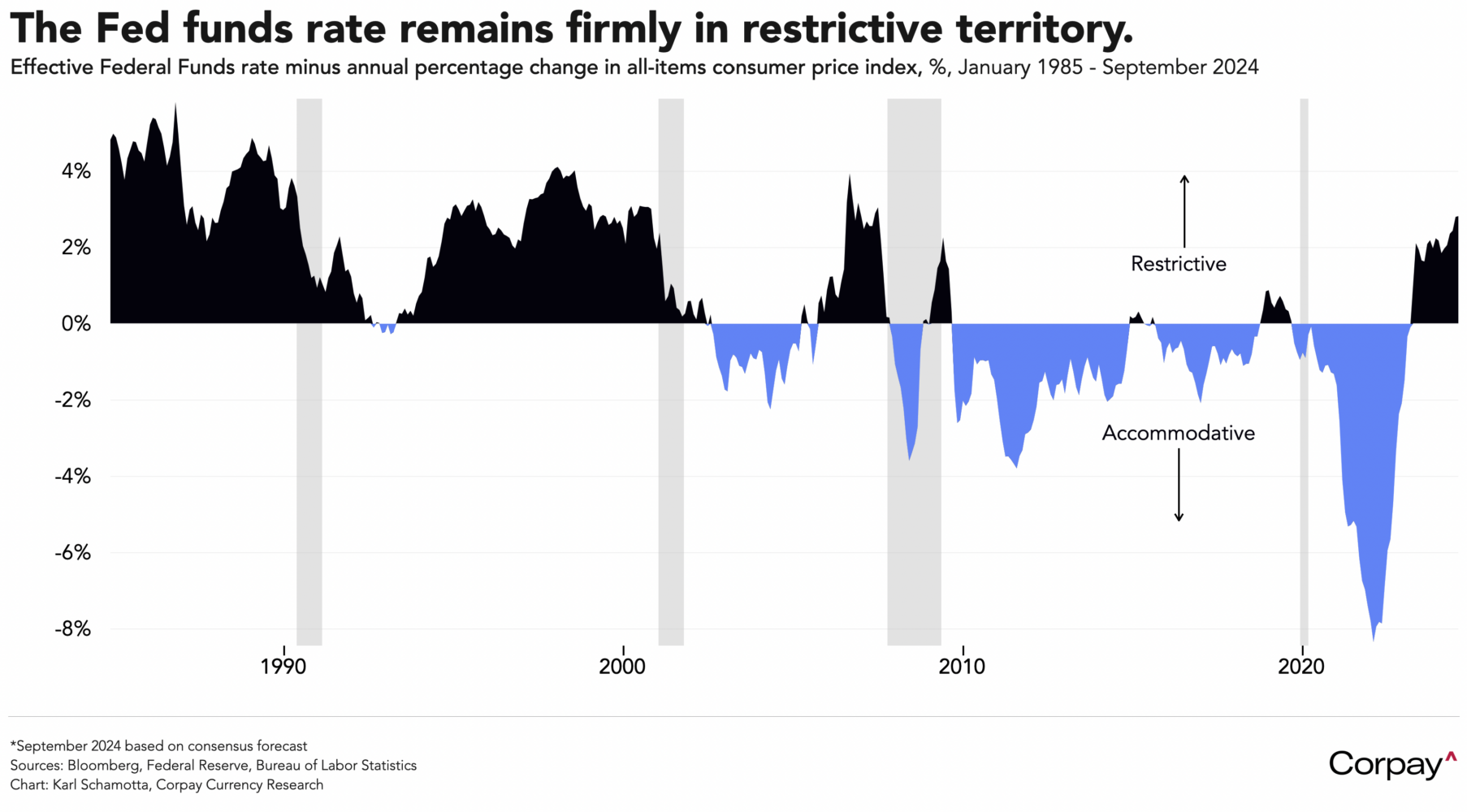 Policymakers now look unlikely to deliver another outsized move this year. Hiring accelerated in September, unemployment declined, and a raft of other data releases pointed to continued strength in consumer spending and business investment, reducing the likelihood that a rapid economic deceleration is already underway. Dallas Fed president Lorie Logan yesterday said “Following last month’s half-percentage-point cut in the Fed funds rate, a more gradual path back to a normal policy stance will likely be appropriate from here to best balance the risks to our dual-mandate goals”. Odds on aggressive rate cuts have plunged even with the policy rate remaining well above the pace of inflation, with just 43 basis points in easing now priced into futures markets before the end of the year – equivalent to less than two quarter-percentage-point moves between the November and December meetings.