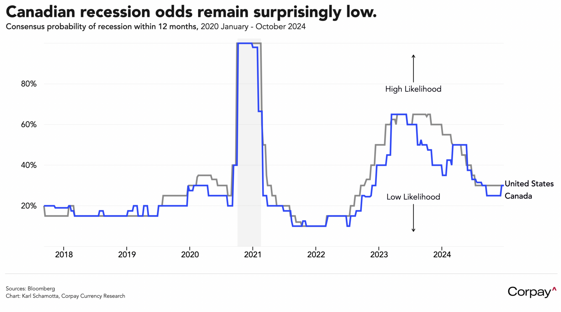But there are significant unknowns. Seasonal adjustment effects and recent changes to the government’s student visa and temporary foreign worker policies could play havoc with key metrics in the jobs report, and we think markets should also remain alert to consumer sentiment changes in the survey data. Our evidence is largely anecdotal so far – and the country’s debt overhang remains incredibly worrisome – but slowing inflation and falling interest rates seem to be translating into an improvement in household views on Canada’s all-important real estate market, limiting the likelihood of an imminent downturn and reducing the need for an acceleration in the pace of rate cuts. Economists generally seem to agree – probabilities derived from consensus forecasts suggest less than one-in-three odds of a recession in Canada over the next 12 months, exactly in line with the United States.