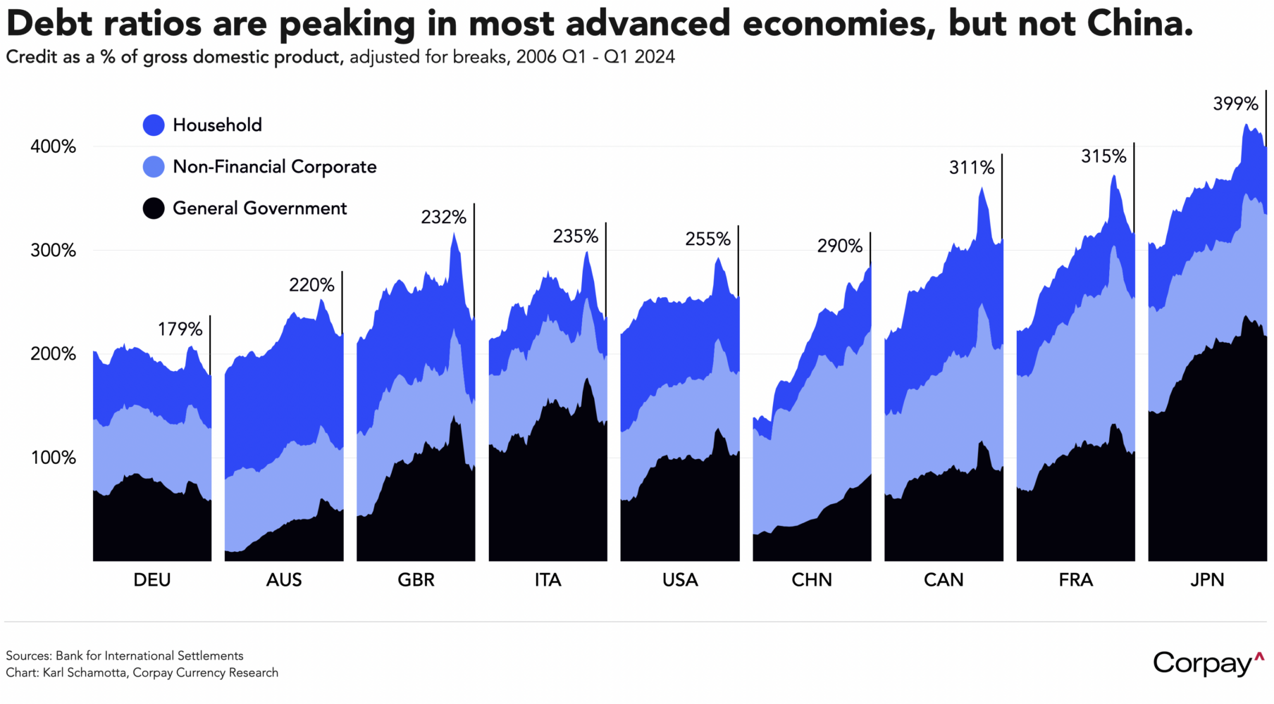 *Apropos of a couple of questions from kind readers, a point of clarification on yesterday’s chart comparing global debt-to-gross domestic product ratios with per capita output numbers: the debt calculation used was for private non-financial sector debt, which includes the household and non-financial corporate sectors but does not include governments. For a more inclusive perspective, here is how debt ratios stack up across the major economies – and note that you can find data on our dashboard here whenever you want the updated numbers.