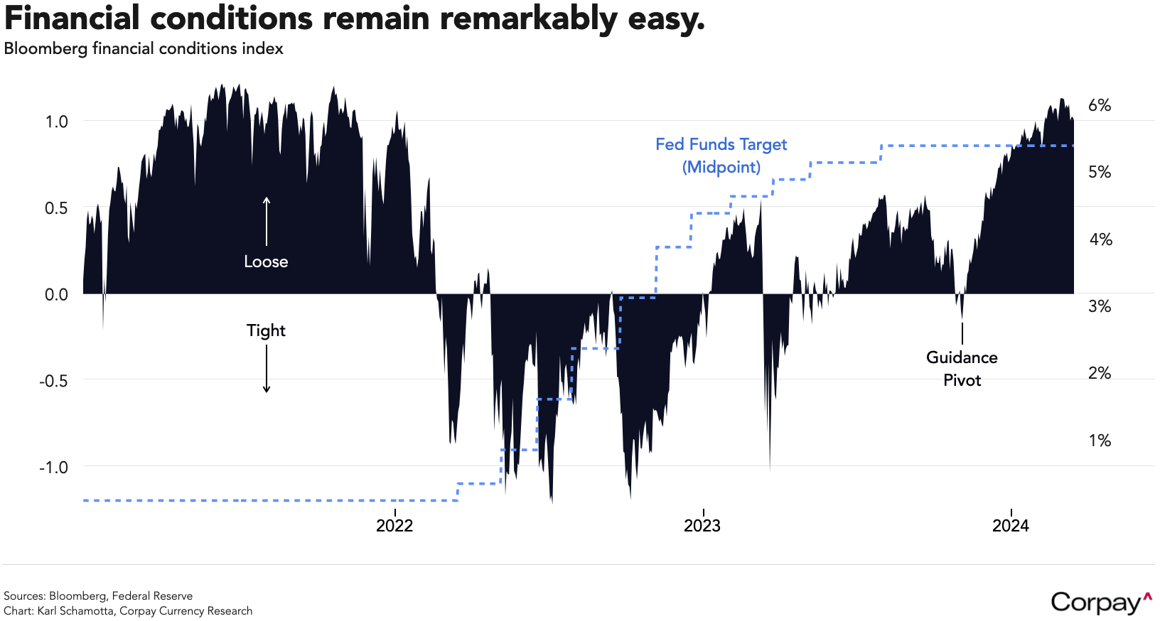 The “dot plot” presented after next week’s Fed meeting could prove more important than the decision itself. A material change seems unlikely, but remarkably-loose financial conditions, stubbornly strong underlying inflation pressures, and signs of a re-acceleration in growth across the real economy – potentially reinforced in tomorrow’s retail sales report – could persuade several policymakers to take back one of the three rate cuts that were projected back in December. Odds on a hike at the June meeting, as implied in futures markets, are now at 58 percent, essentially unchanged relative to Monday’s levels – but the picture could change fairly dramatically if officials sound more hawkish than expected.
