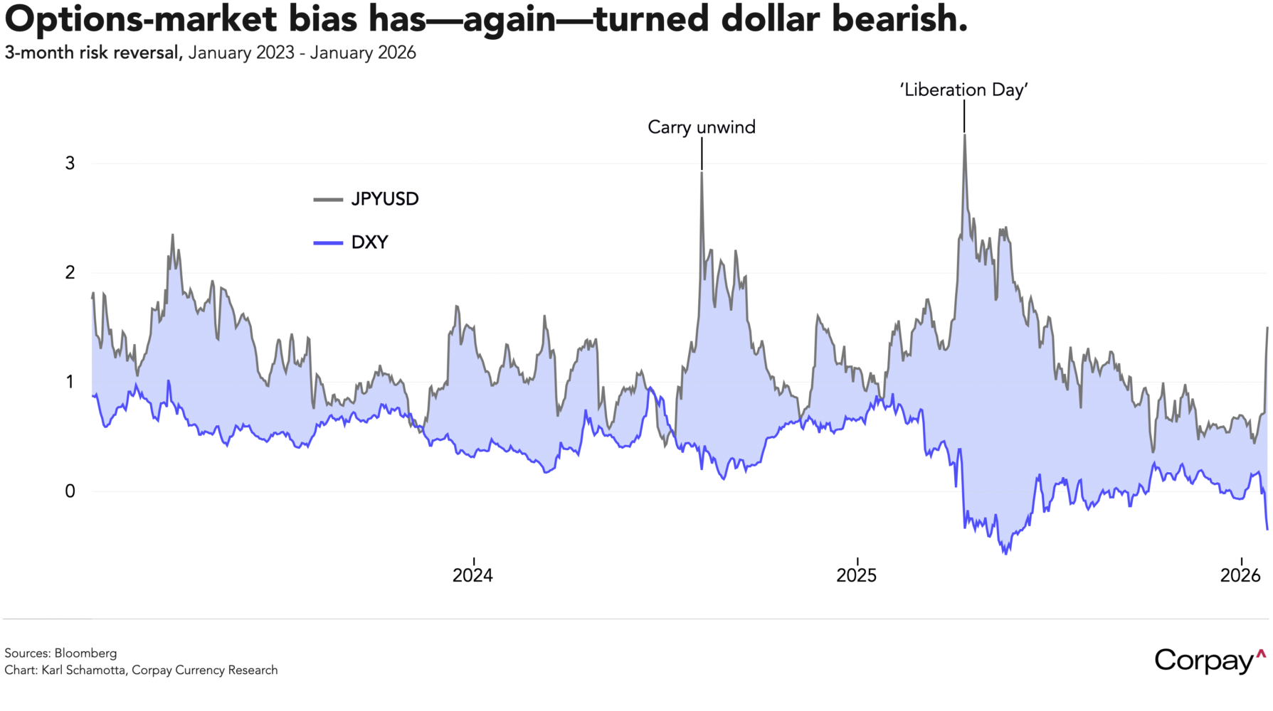 Positioning has turned profoundly dollar-bearish. Risk reversals—which measure skewness in option market positioning—are once again pointing to steep declines in the dollar, particularly against the yen, and talk of “debasement” has ratcheted up to deafening levels.