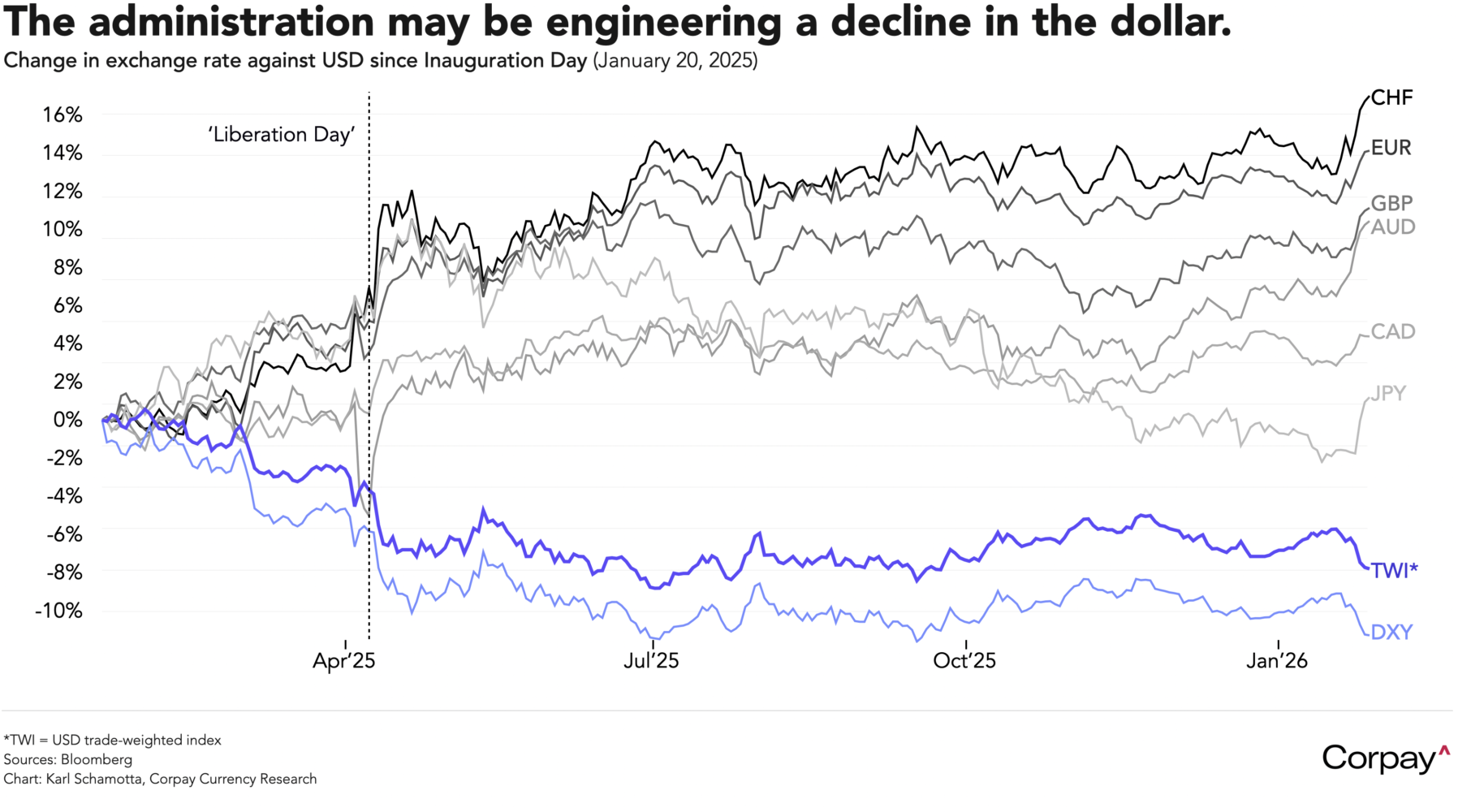 There are good reasons to suspect that the Trump administration is deliberately engineering a decline in the dollar’s value on foreign exchange markets. The intellectual positions advanced by officials like JD Vance, Stephen Miran, Scott Bessent, and Trump himself before taking office were largely consistent with the idea that the dollar’s overvaluation represents an “exorbitant burden” for US businesses, and policy actions over the last year have not been consistent with making the greenback great again. The currency has underperformed all of its major counterparts since Inauguration Day.
