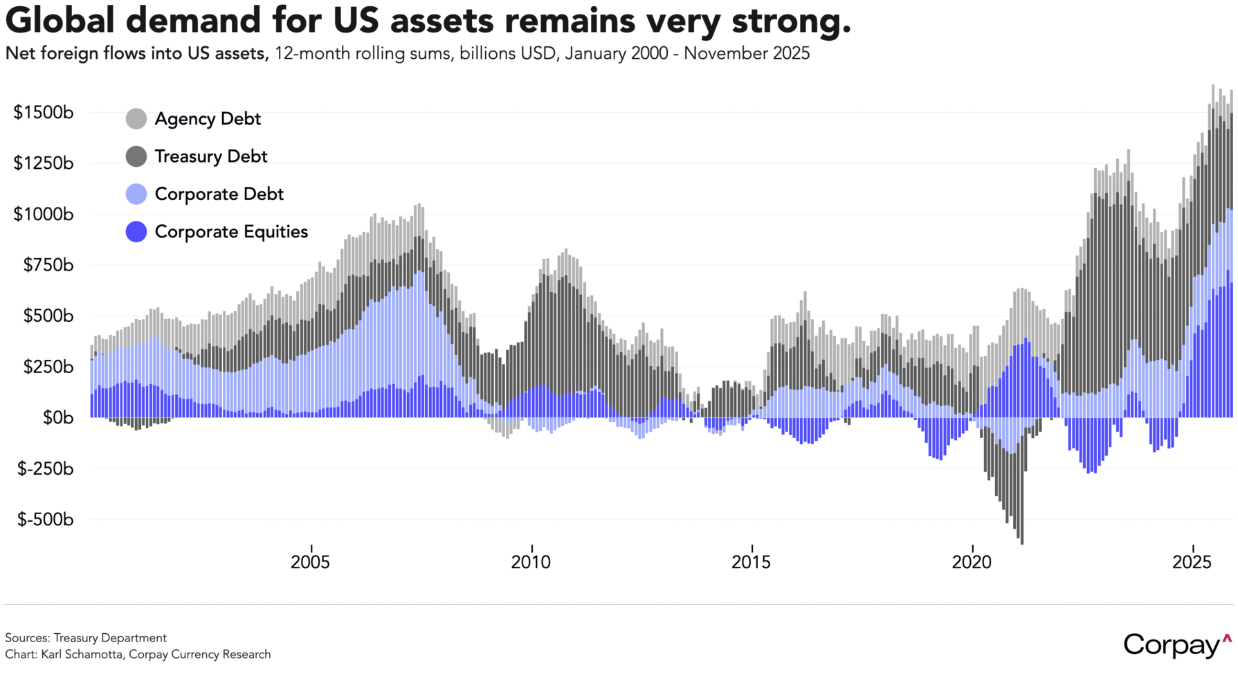 But the supplementary market signals that would accompany genuine currency debasement are conspicuously absent. Treasury yields remain stable, inflation expectations well-anchored, and the term premium—the additional compensation investors demand for bearing long-term interest rate risk—sits below 2014 levels. Although hedging volumes have increased as investors have grown more sceptical of American institutional stability, underlying capital flows into dollar-denominated assets have remained incredibly strong, underlining sustained appetite for US debt and equity instruments.