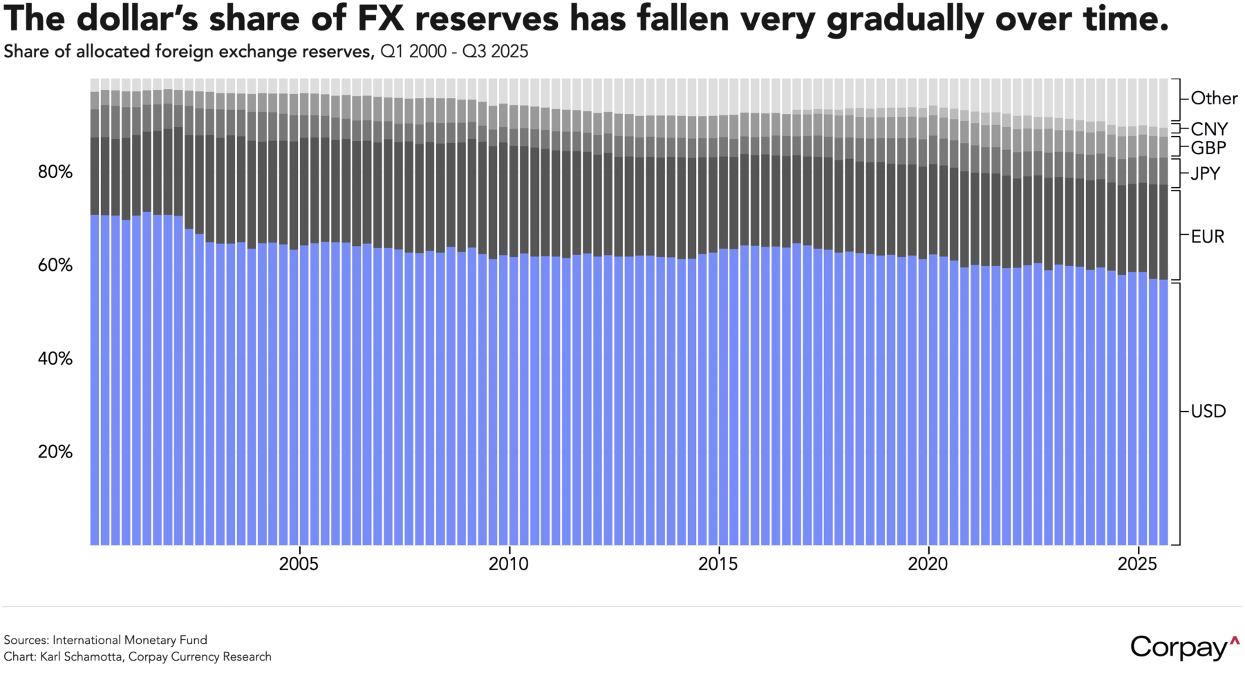 Central banks are not diversifying away from the dollar in any meaningful way. Higher valuations have lifted gold’s share of reserve assets, but new purchases have slowed sharply over the past two years. With emerging markets becoming more stable and China stepping back from currency intervention, global reserve accumulation has fallen sharply in the past decade. The dollar’s share of foreign exchange reserves—excluding gold—has declined only gradually, to about 56 percent from 70 percent in 2000, and remains well above the 48 percent recorded in 1990. This stability reflects the greenback’s outsized role in trade and cross-border debt flows, rather than any abstract assessment of its long-term return prospects.