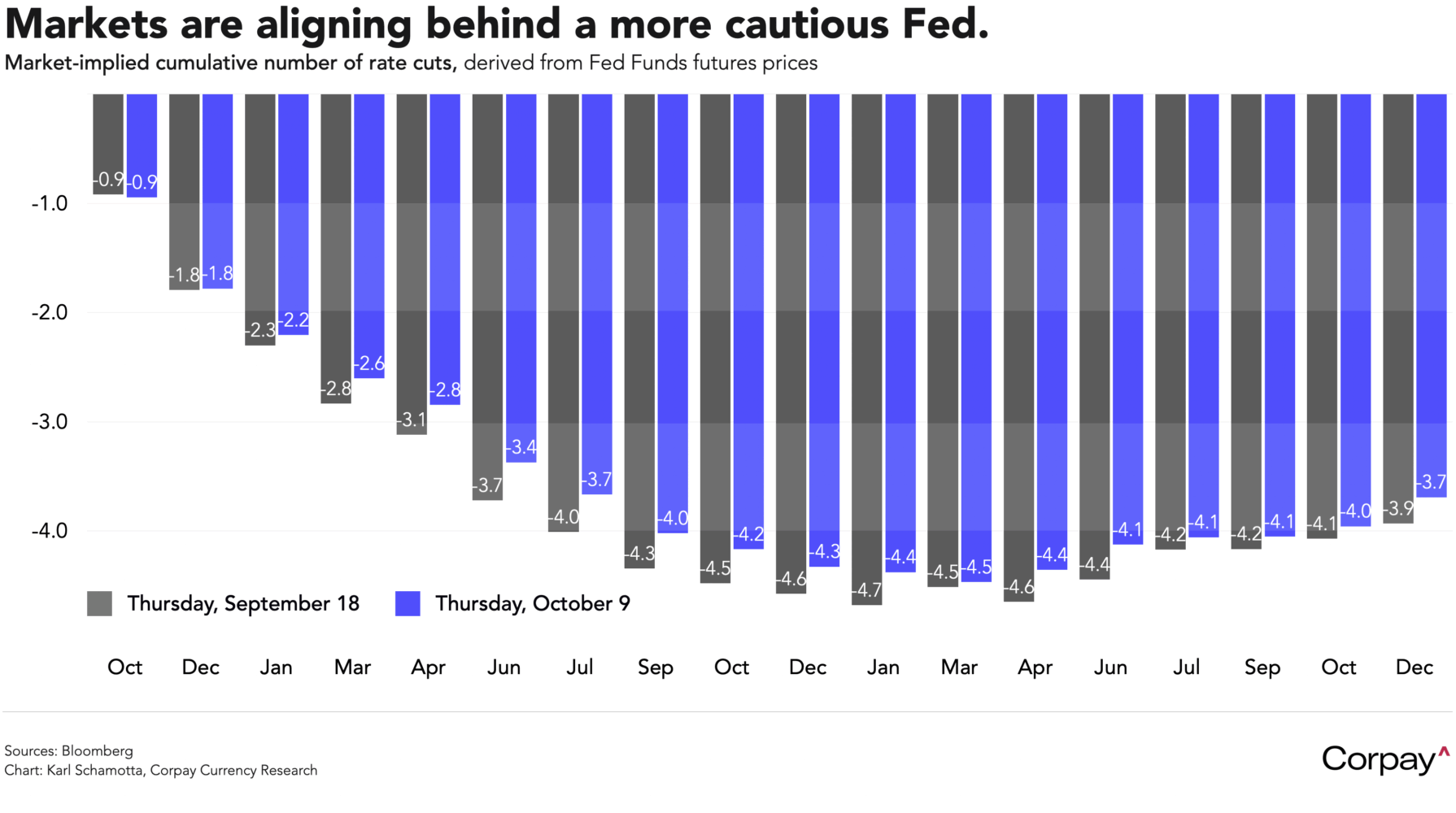 A record of the Federal Reserve’s last meeting showed policymakers expressing conflicted views on the path for inflation, employment, and interest rates ahead. According to minutes taken during the central bank’s September discussion, “Most judged that it likely would be appropriate to ease policy further over the remainder of this year,” given that many saw “downside risks to employment as having increased” between meetings. However, “a majority of participants emphasized upside risks to their outlooks for inflation,” and “some” noted that financial conditions indices are suggesting that monetary policy “may not be particularly restrictive,” warranting a “cautious approach” to cutting in the months ahead. A narrow majority favoured easing at least twice more in 2025, but Trump appointee Stephen Miran was alone in projecting a series of emergency-style cuts ahead. Seven of the nineteen voters on the committee were in favour of leaving policy unchanged, including one who thought borrowing costs should climb by year-end.