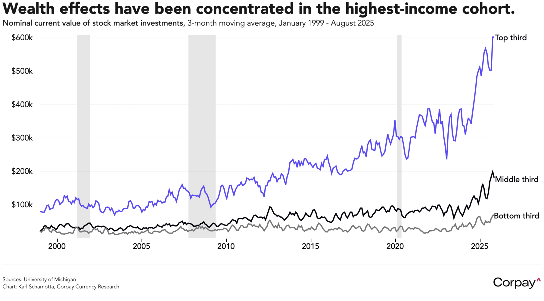 But this virtuous cycle could quickly devolve into a vicious one. The majority of American households—those in the low- and middle-income brackets—remain far more constrained, facing stretched credit, slowing wage growth, and rising employment concerns. Should an unexpected shock erode the paper wealth concentrated at the top, the resulting pullback in high-income consumer spending could reverberate through the economy, tipping it into a deeper downturn.